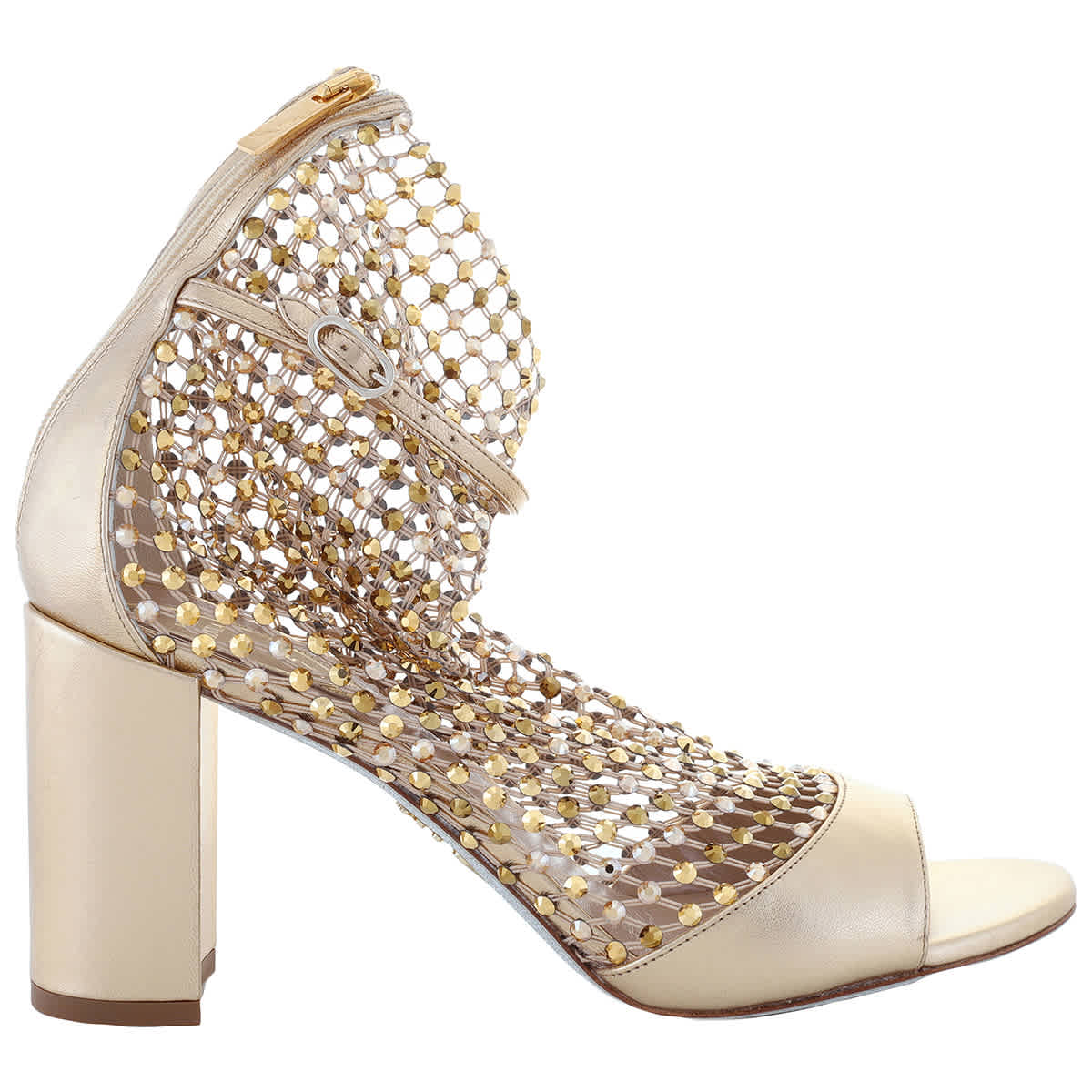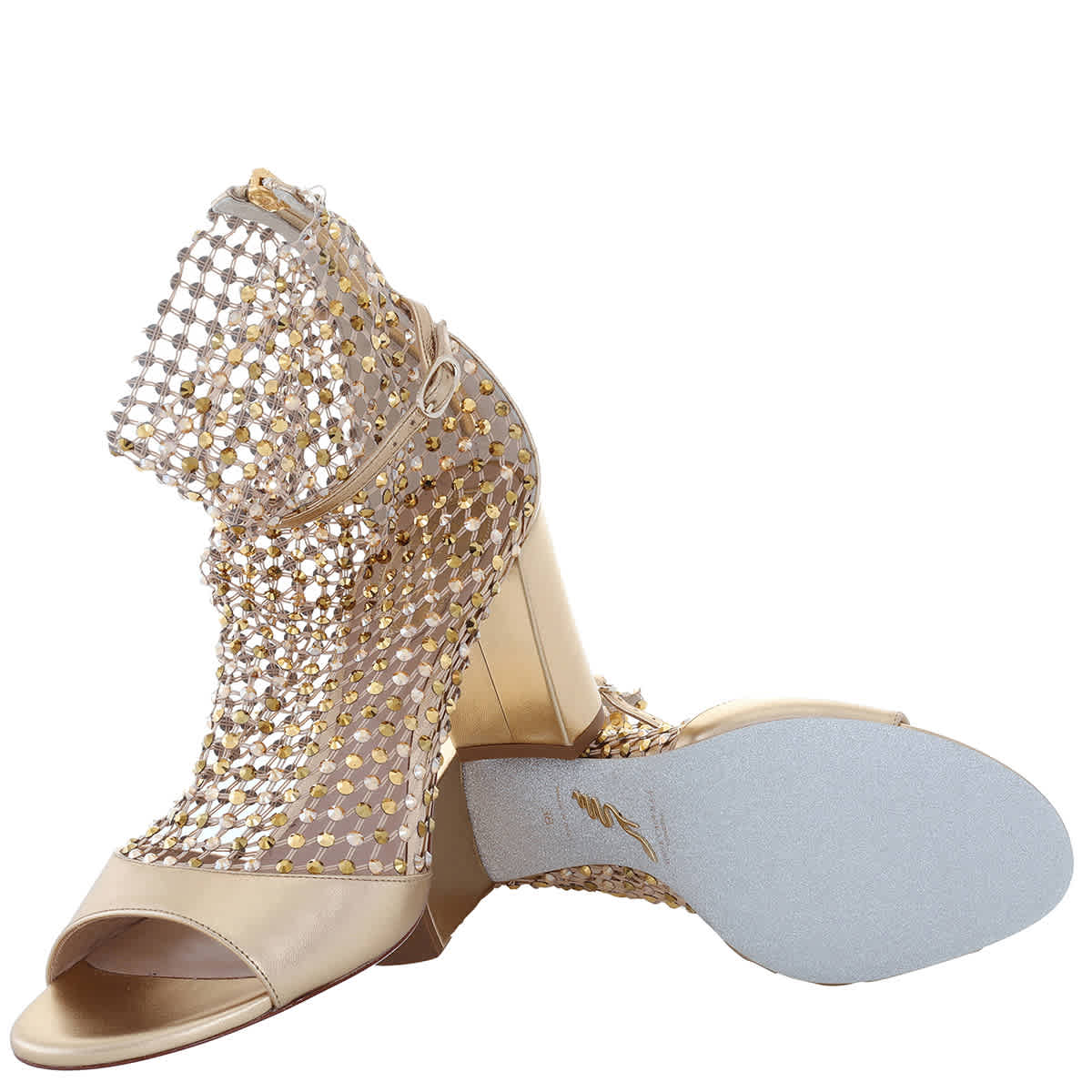 Женские босоножки Rene Caovilla. Цвет: золотой. Босоножки Rene Caovilla Gold Galaxia 80 Jeweled. Босоножки Galaxia с завораживающей сеткой кристаллов обвивают стопу, подчеркивая мерцающий шарм подошвы, напоминающей звездную пыль. Круглый носок и блочный каблук высотой 80 мм. Сделано в Италии.