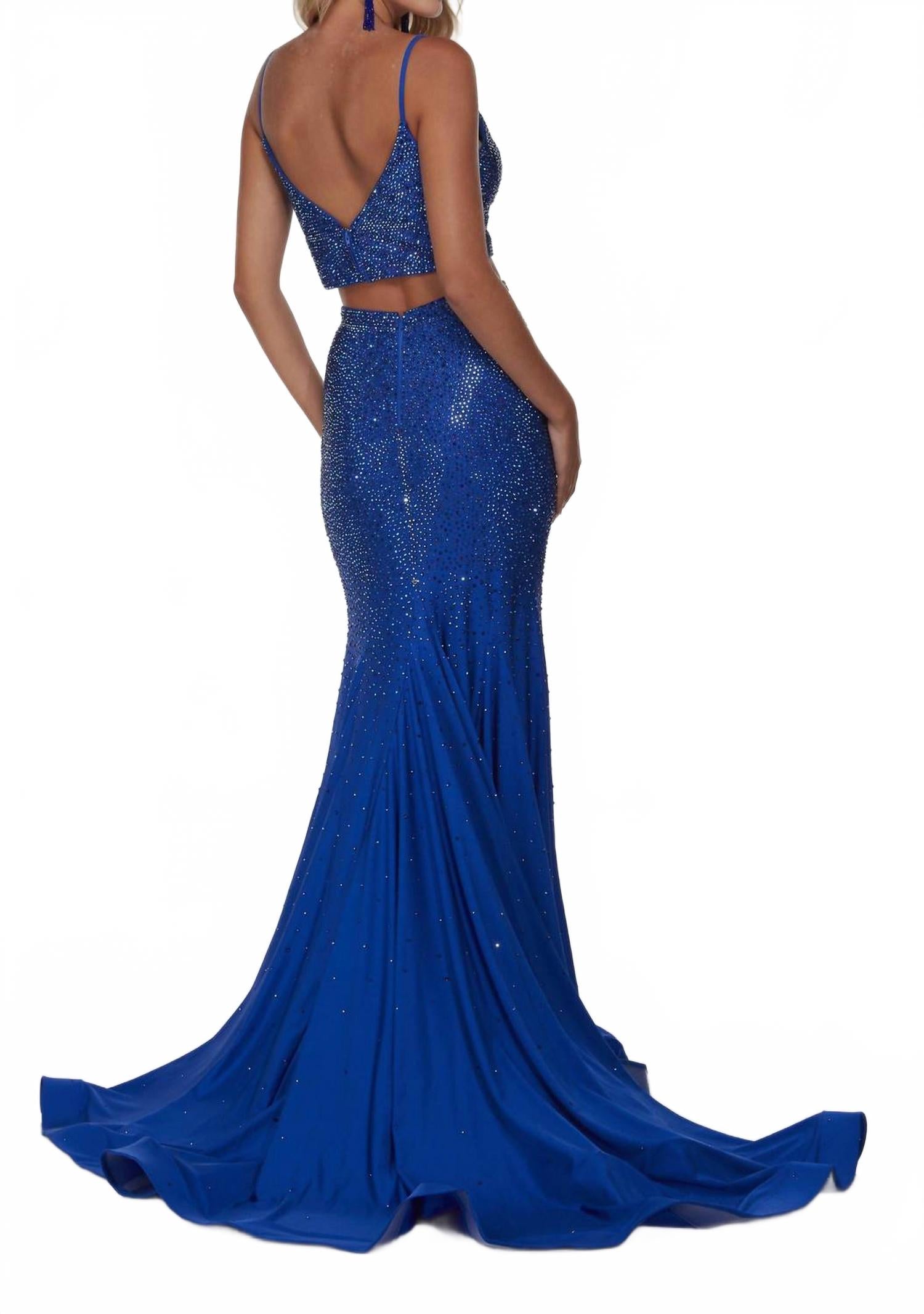Это эффектное платье-двойка с тонкими бретельками и V-образным вырезом, изящно переходящим в облегающий силуэт, выполнено в технике футляр. Узорчатый ансамбль дополнен застежкой-молнией для удобства надевания. Это платье идеально подходит для создания запоминающегося образа и станет стильным выбором для любого выпускного вечера.