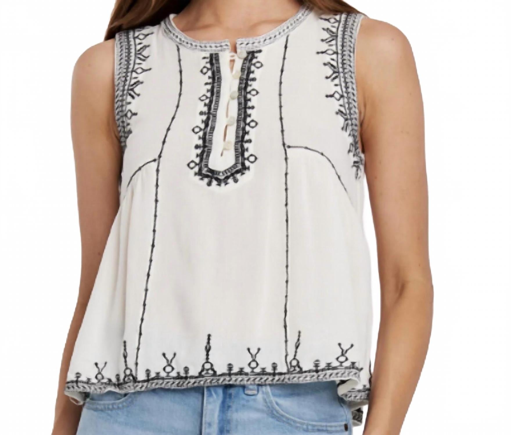 Эта классическая майка идеально подходит для многослойной одежды и достаточно симпатична, чтобы носить ее отдельно. Дополните свой летний гардероб майкой Kit от Another Love с игривой вышивкой в ​​шикарных кремово-черных тонах. Эта модель без рукавов имеет свободный овальный вырез для непринужденного стиля и комфорта. Состав: 100% вискоза. Застежка: пуговицы. Идеально подходит для отпуска.