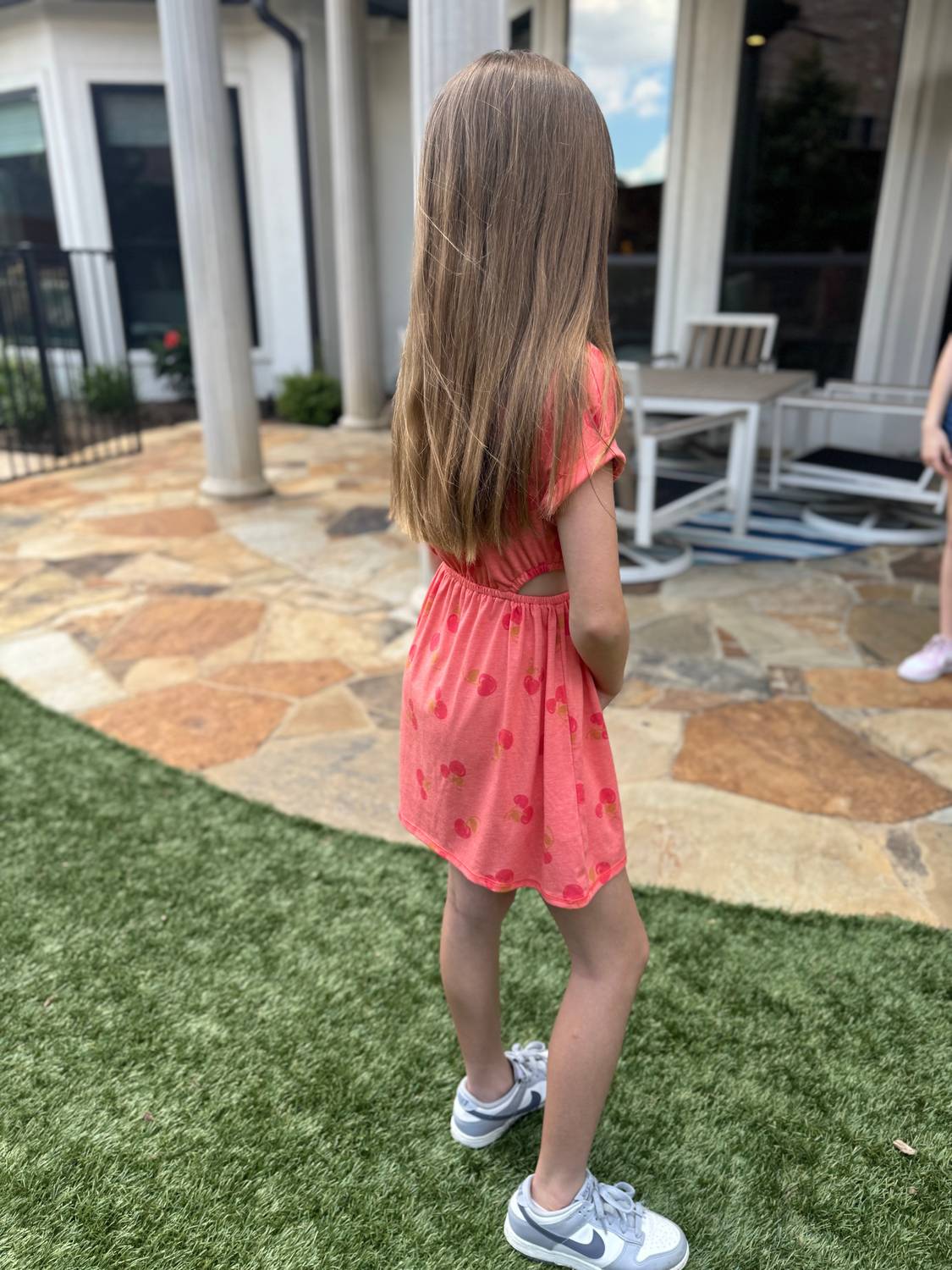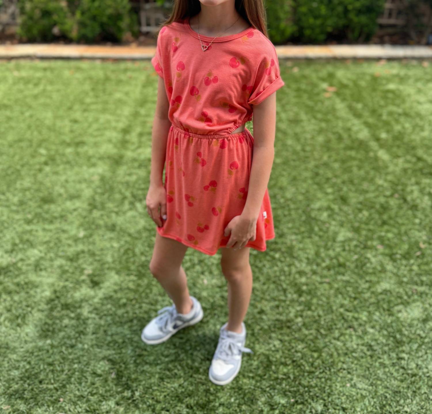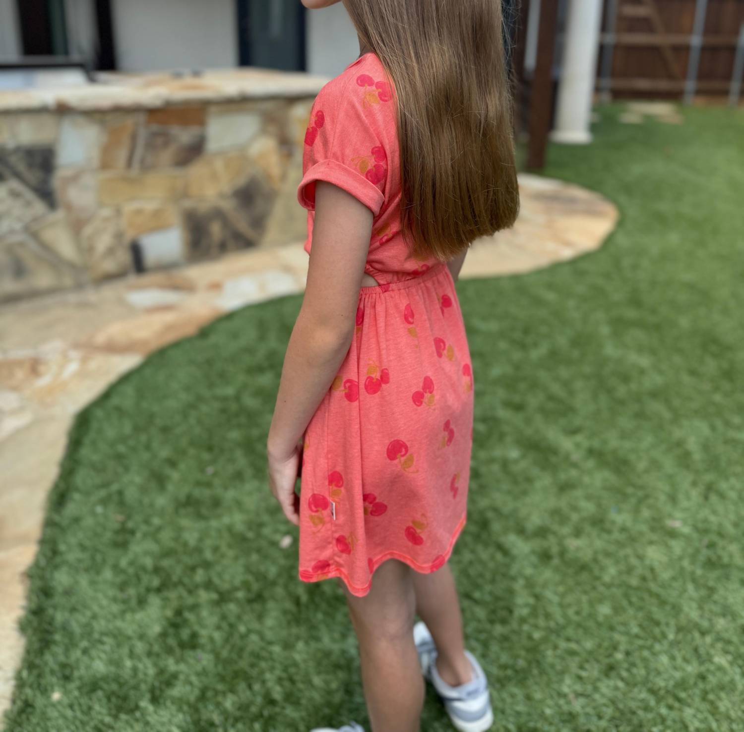 Очаровательное платье меланжевого цвета с восхитительным вишневым рисунком. Короткие рукава с отворотами и вырезы по бокам. Изготовлено из трикотажной ткани с добавлением хлопка (48% хлопка, 48% модала и 4% лайкры). Платье изящно драпируется, образуя силуэт длиной до бедра. Застежка на петлю-пуговицу сзади. Можно стирать в стиральной машине для легкого ухода. Произведено в США.