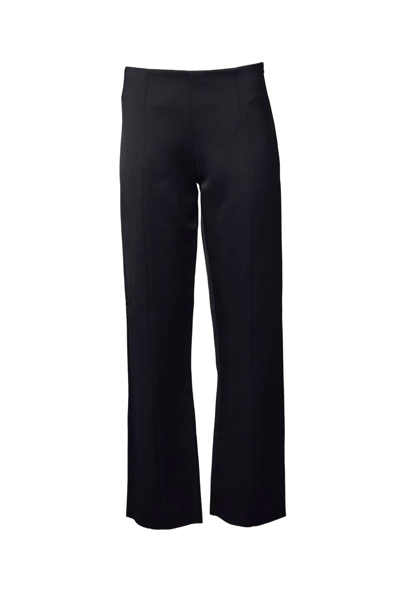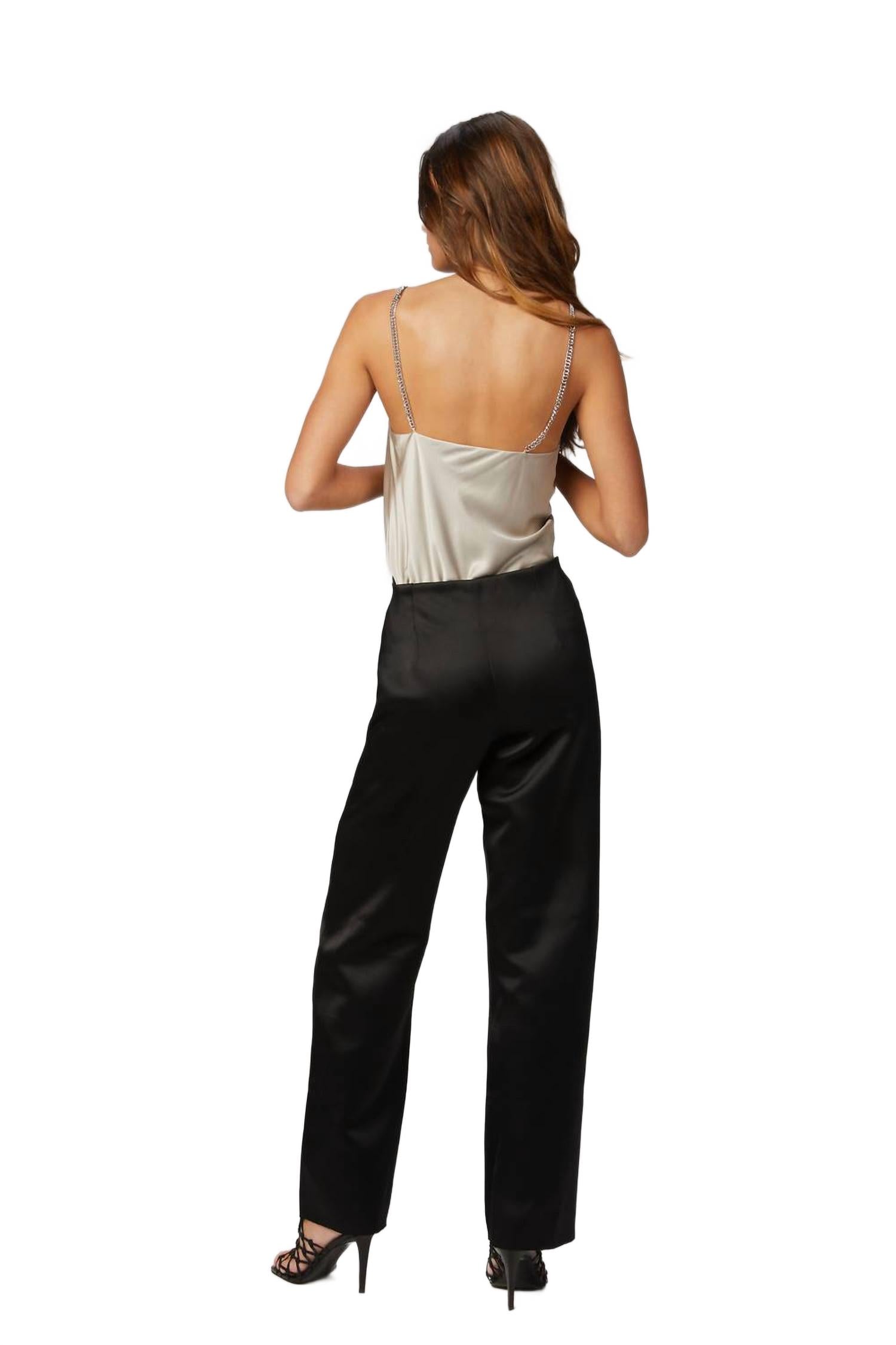 Брюки средней посадки из тканого атласа. Центральный шов спереди, вытачки сзади, потайная молния сбоку и необработанный нижний край.