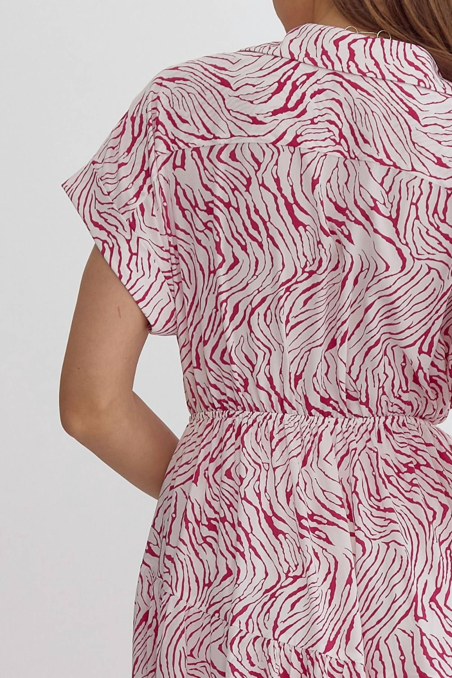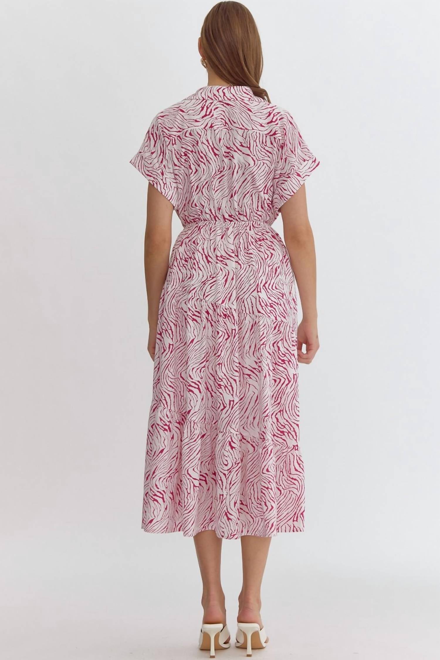 Представляем платье миди Zebra от Entro - стильное дополнение к гардеробу любой женщины благодаря модному розово-белому узору. Это платье А-силуэта с V-образным вырезом и короткими рукавами создает стильный силуэт. Благодаря удобным карманам и удобной застежке-липучке оно идеально подойдет как для повседневных, так и для нарядных образов.