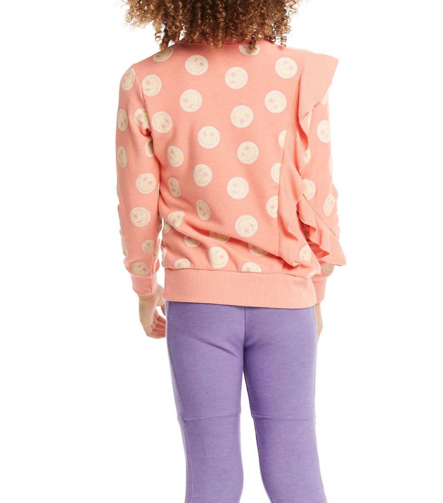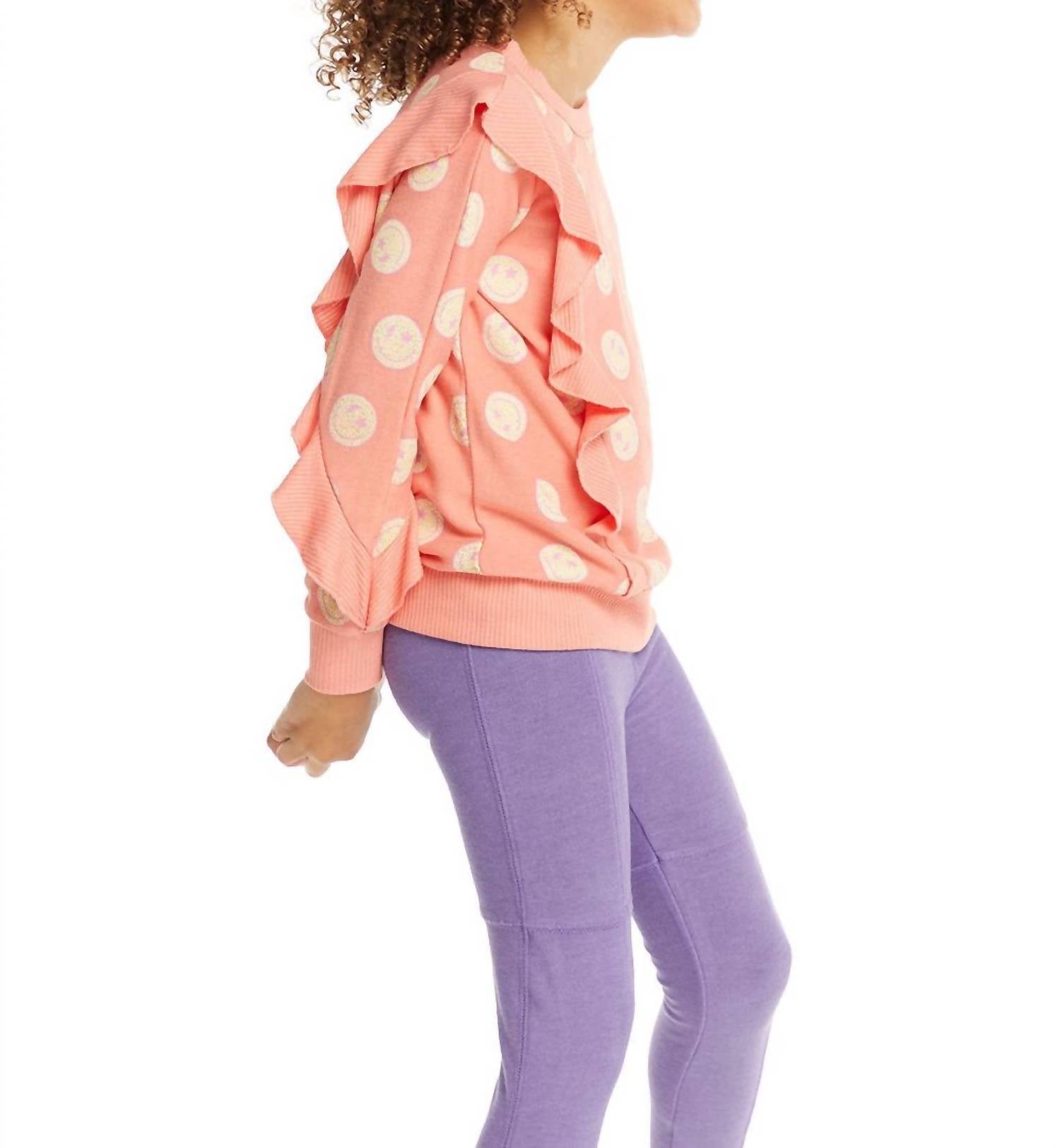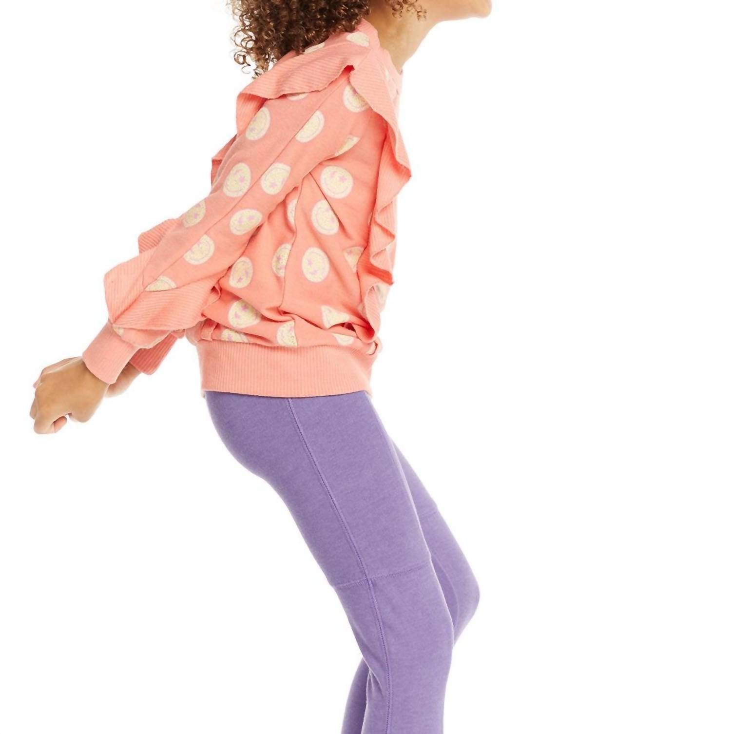 Позвольте ей продемонстрировать свою дикую натуру в этом топе с длинными рукавами и оборками для девочек от Chaser. Этот стильный топ с длинными рукавами и принтом в виде леопардовых смайликов на розовой основе с рисунком ракушек идеально подходит для вашей модницы. Этот топ, изготовленный из 49% полиэстера, 46% вискозы и 5% спандекса, сочетает в себе комфорт и стиль.
