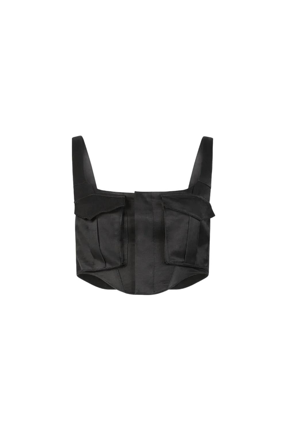 Этот черный топ-корсет из эластичного хлопка с квадратным вырезом и потайной застежкой спереди имеет безрукавный крой, два передних кармана с клапанами и закругленный подол, напоминающий корсет. Карманы-карго с клапанами и укороченный перед придают ему особый стиль. Состав: 64% хлопка и 36% вискозы.