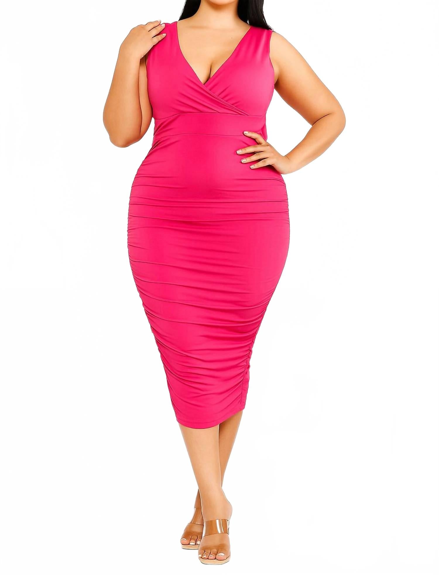 Привлеките внимание в этом облегающем платье со сборками, подчеркивающем изгибы тела, с глубоким V-образным вырезом, широкими бретелями и подолом средней длины. Смелое и привлекающее внимание, оно предлагает элегантный силуэт, который легко перейдет как из дневного, так и из вечернего образа.