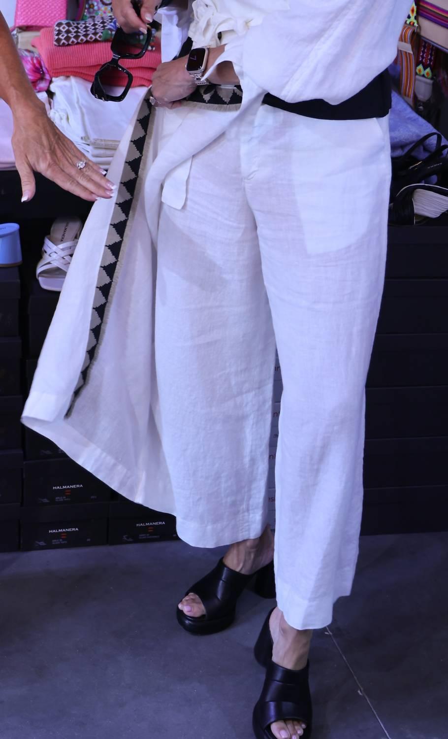 100% ленЮбка-запах с высокой талиейЗастежка на скрытую металлическую застежку сбокуВертикальная декоративная отделка на переднем накладеОтделка украшена геометрическим узором с черными треугольниками и бежево-коричневым контуромБрюки с вшитой юбкой спереди.Примечание: на бежевой фотографии показан только рисунок спереди - сама юбка белая, как и на трех других фотографиях.