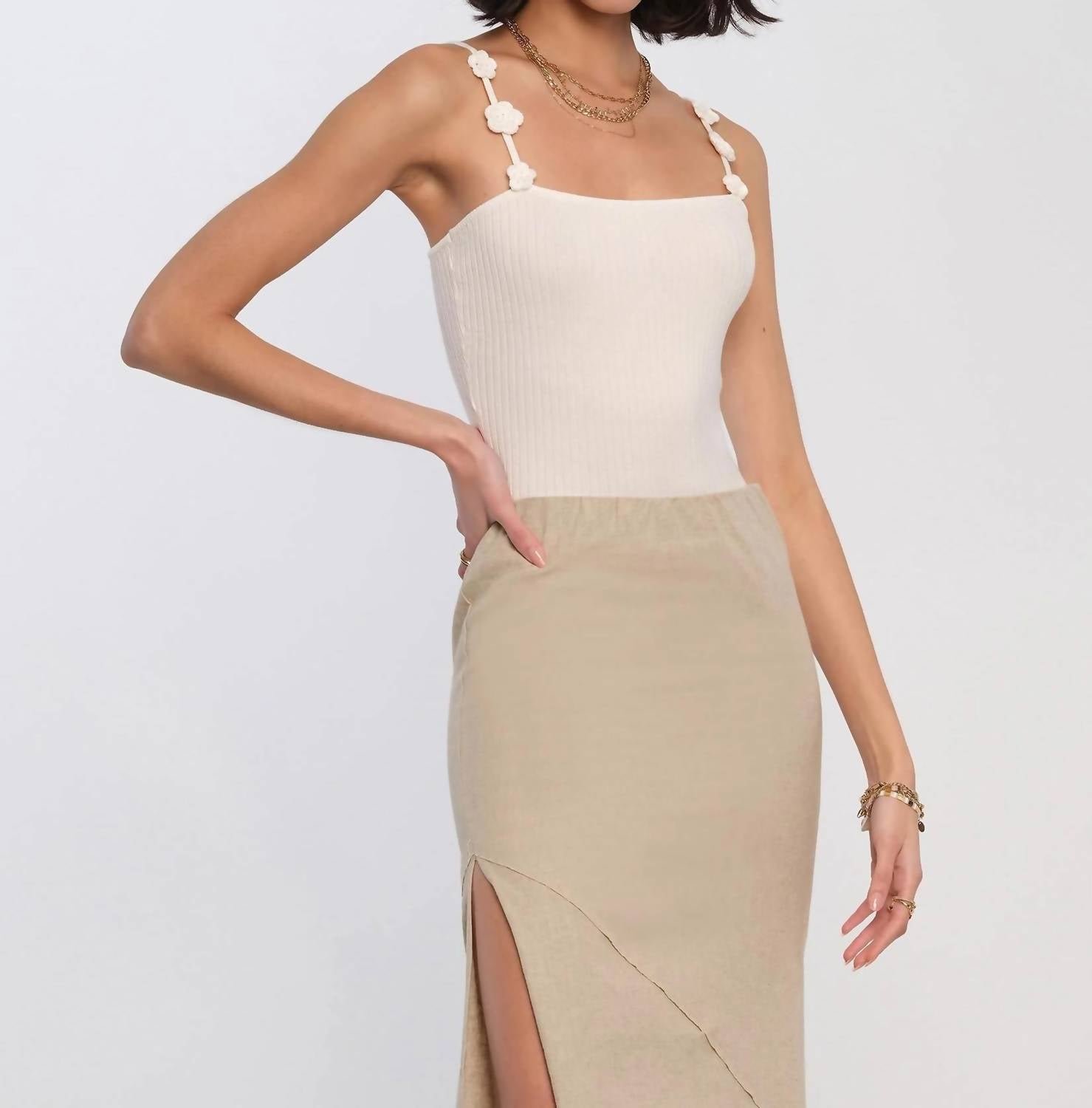 Струящаяся, удобная и стильная. Эта макси-юбка - фаворитка поклонников. Откройте для себя юбку Lulu от Heartloom - элегантную макси-юбку натурального цвета из текстурированной льняной ткани. Юбка имеет облегающий А-образный крой, потайную резинку на талии для комфорта и стильный разрез сбоку. Состав: 55% лен, 45% хлопок. Длина изделия: 38,5 дюйма. Уход: только химчистка.