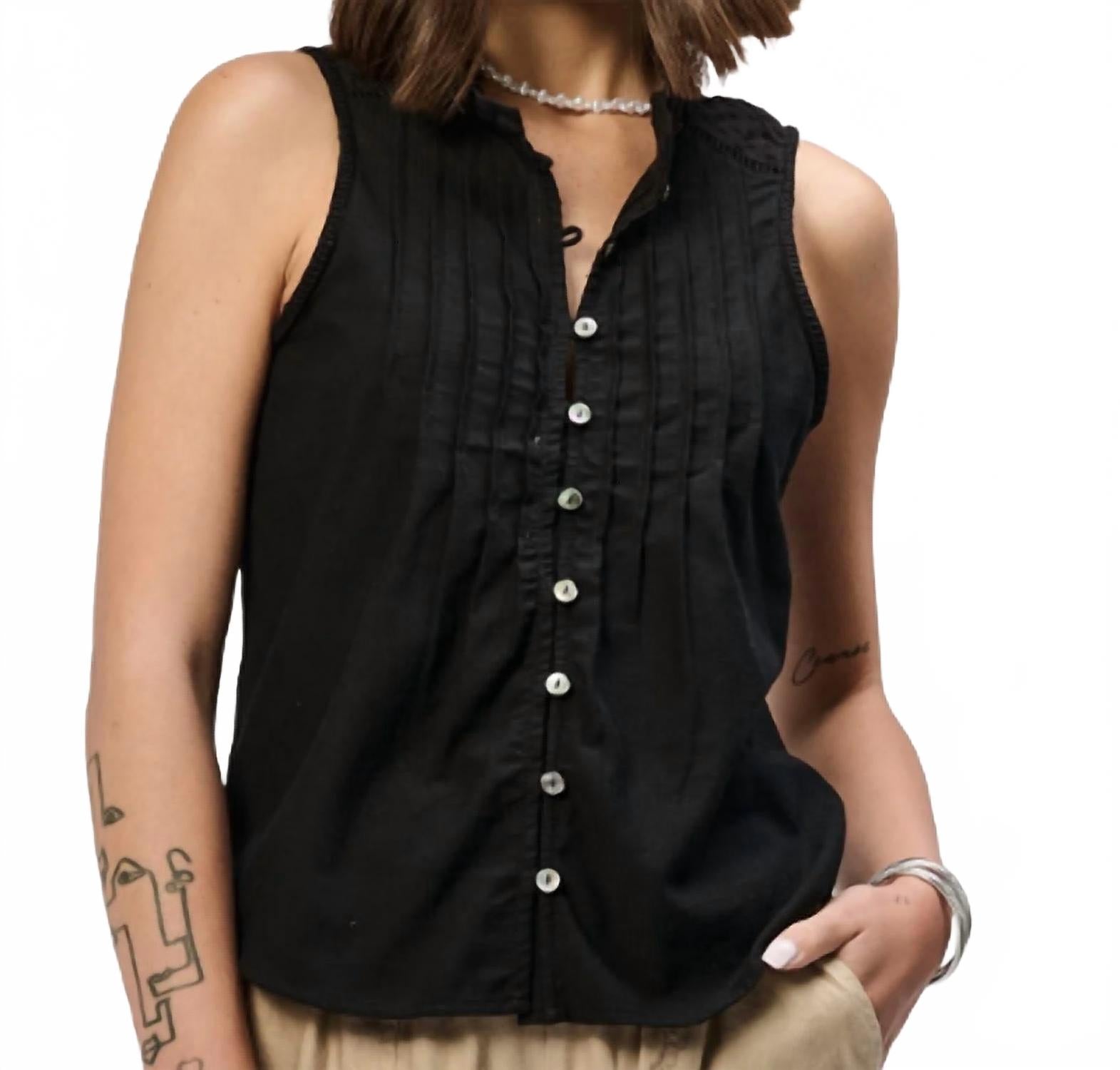Блузка, которая никогда не выйдет из моды. Дополните свой летний гардероб топом Kayda от Another Love, который обеспечит вам ощущение прохлады и элегантности. Эта безрукавка элегантного черного цвета с защипами и V-образным вырезом, подчеркивающим фигуру. Изготовленная из 100% хлопка, она обеспечит максимальный комфорт и стиль. Застежка: пуговицы. Уход: машинная стирка.