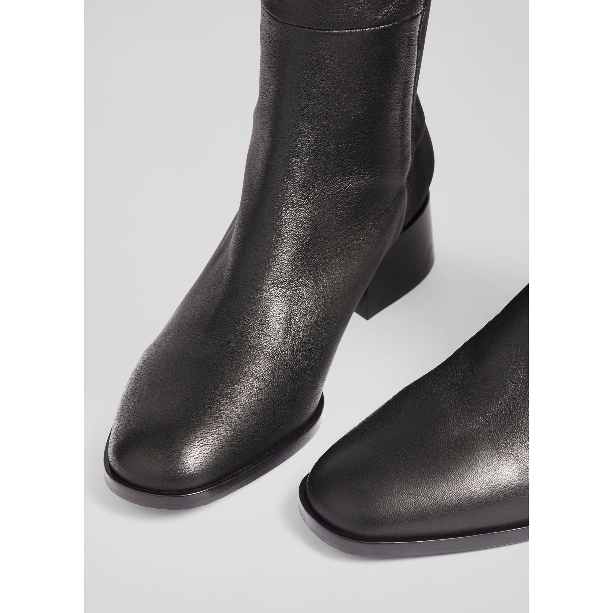 Черные полусапоги Duke с высокой посадкой. В элегантных ботфортах Duke с высокой посадкой вы будете чувствовать себя уверенно в любой обстановке. Эти черные сапоги выше колена изготовлены из роскошной кожи наппа, отличаются элегантным кроем и удобным плоским каблуком. Идеально сочетаются с узкими джинсами или струящейся юбкой, создавая непринужденный и стильный образ.