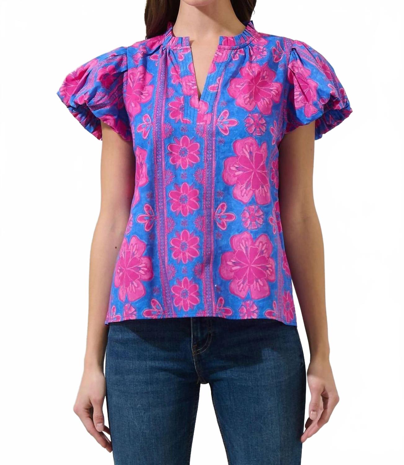 Блузка, которая никогда не выйдет из моды. Насладитесь цветением весны с этим ярким цветочным принтом. Розовые цветы на синем фоне создают образ Bethel Floral. Блузка имеет короткие рукава-буфы с резинкой по краю. Воротник с оборкой, а затем разрез. Носите ее с любым низом на ваш выбор. Разрезной вырез, цветочный узор, хлопок, короткие рукава-буфы, цвет: синяя фуксия.