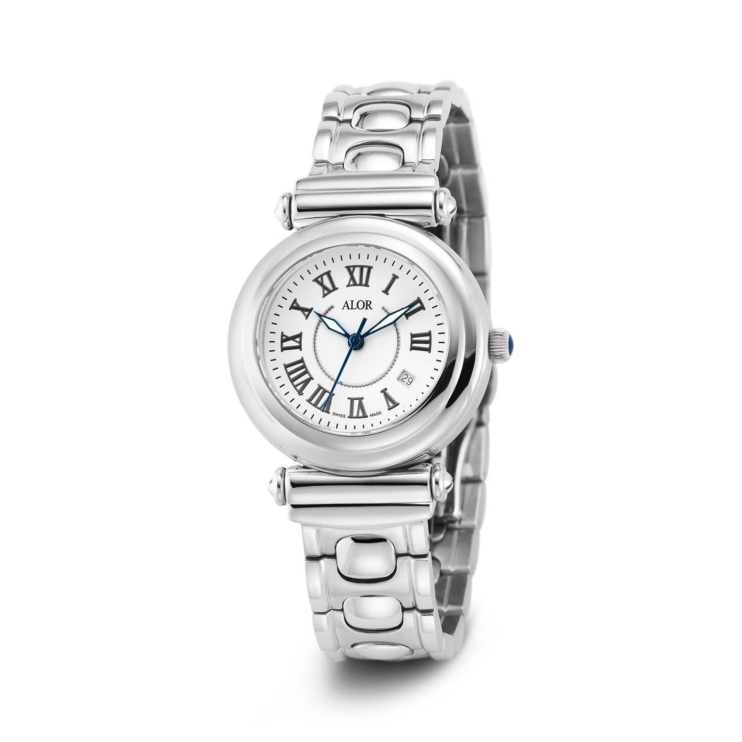 Изысканные часы из гладкой серебристой нержавеющей стали. Корпус диаметром 34 мм. Безель из нержавеющей стали и сапфировое стекло на белом циферблате украшены серебряными римскими метками, придающими часам элегантный вид. Подчеркивают их изысканный вид, делая их незаменимым аксессуаром. Часы рассчитаны на повседневную эксплуатацию и водонепроницаемы до 3 атм.