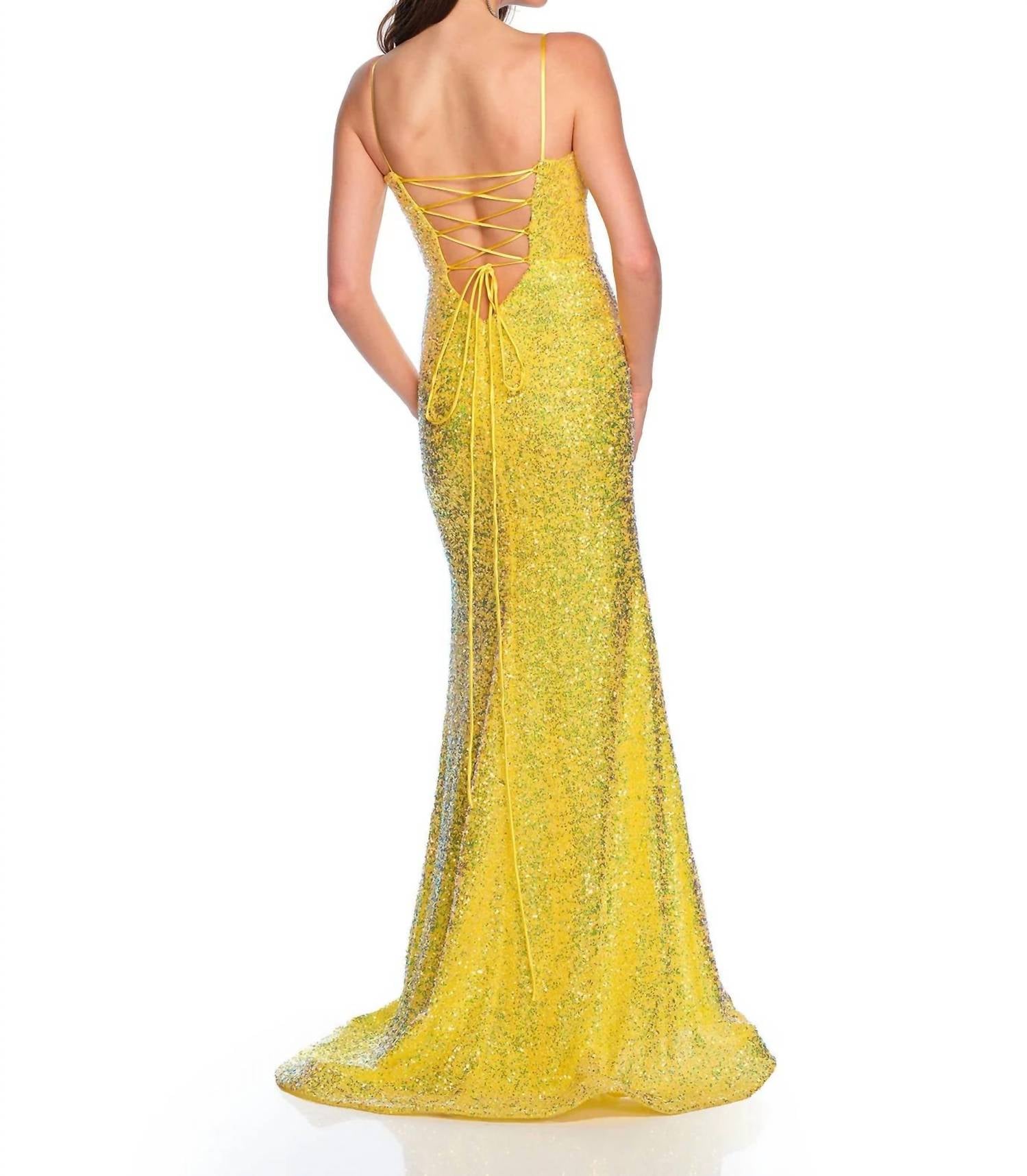 Очаровательное платье желтого цвета длиной до пола с изящными бретельками-спагетти, прямым вырезом и соблазнительной открытой спинкой со шнуровкой. Платье изготовлено из 100% полиэстера и украшено потрясающим узором из пайеток, подчеркнутым облегающим силуэтом. Застежка на молнию.