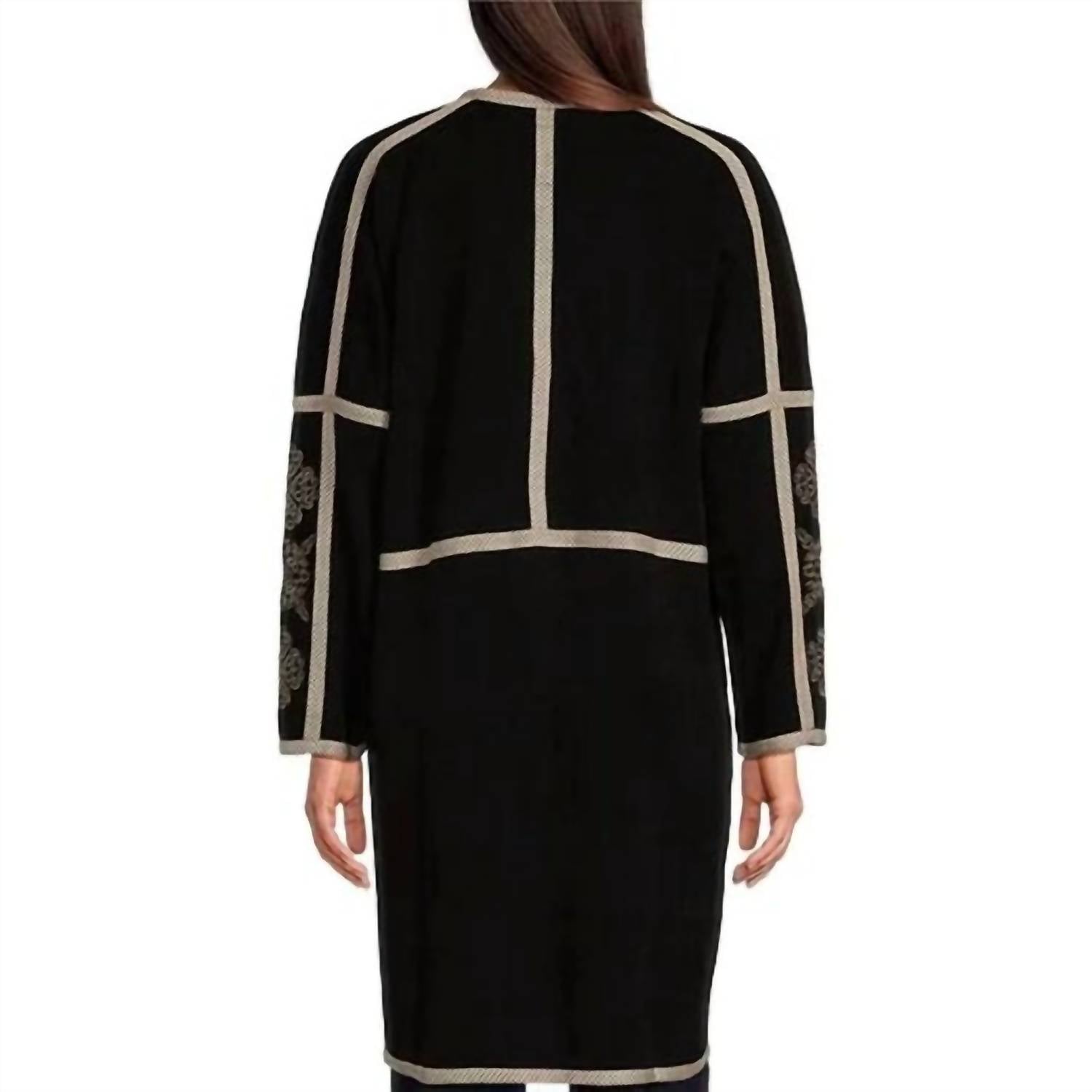 Накиньте этот очаровательный кардиган поверх любой майки или топа. Этот свитер украшен замысловатыми цветочными узорами, дополненными структурированным сетчатым узором, и воплощает изысканность изделий Johnny Was. Это черный свитер с легким мерцанием золотых и серебряных деталей. У пиджака длинные рукава, приталенный крой, потайные кнопки и удобные карманы.