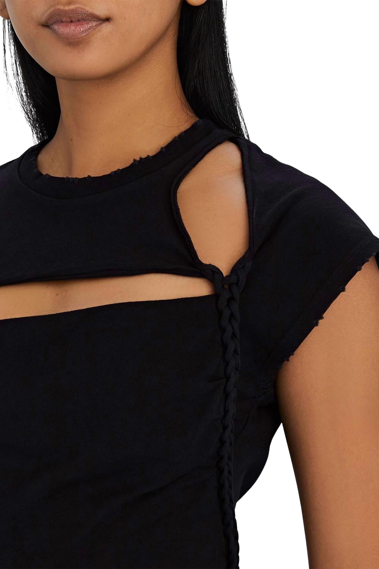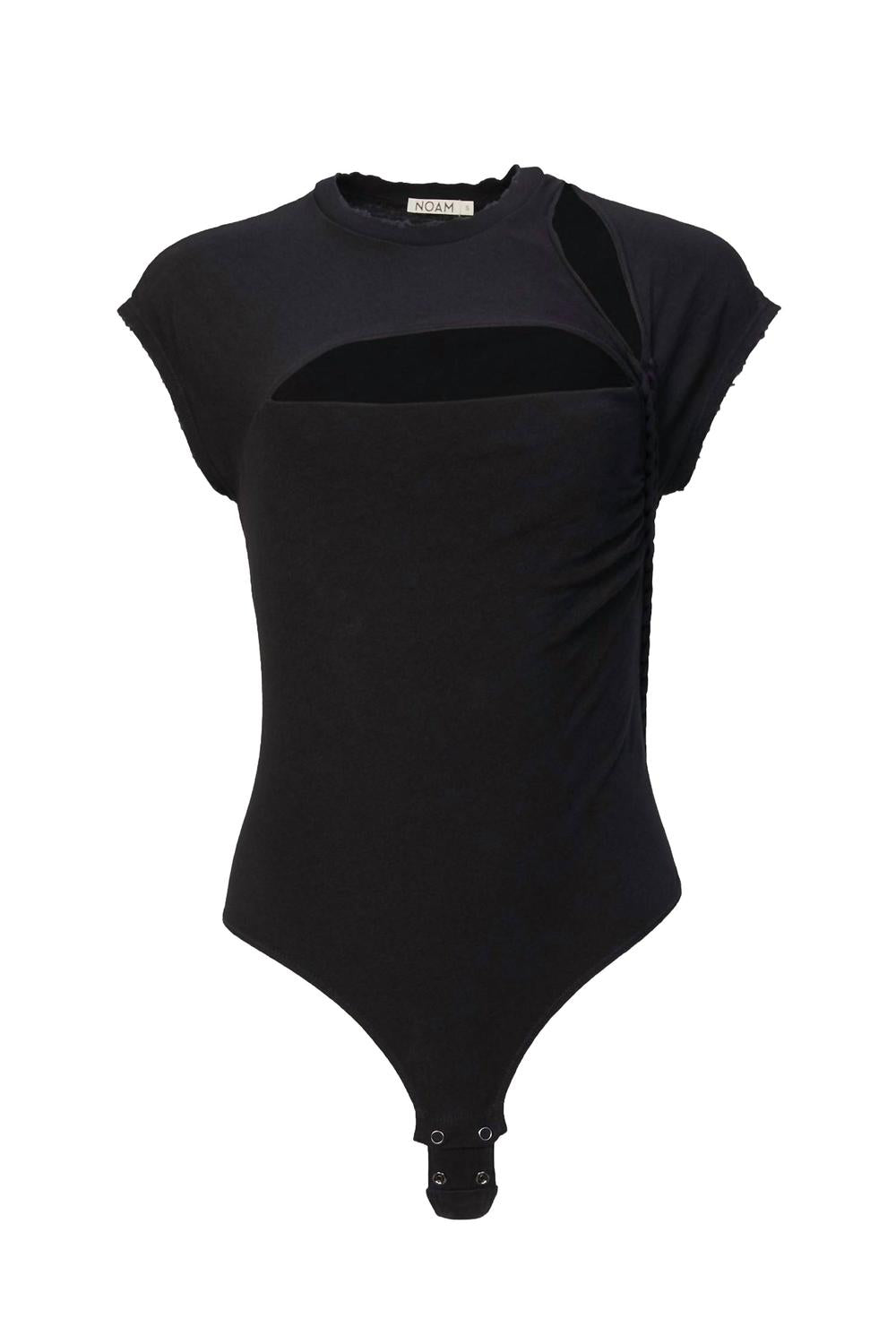 Это боди «Slash» из мягкого хлопка с острыми вырезами в области декольте и плеч, плетеным акцентом и потертым краем. Плавки-стринги практически незаметны под джинсами, брюками и юбками.