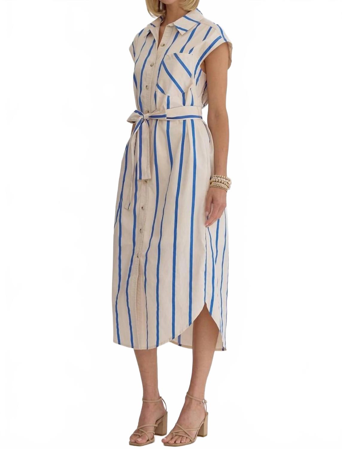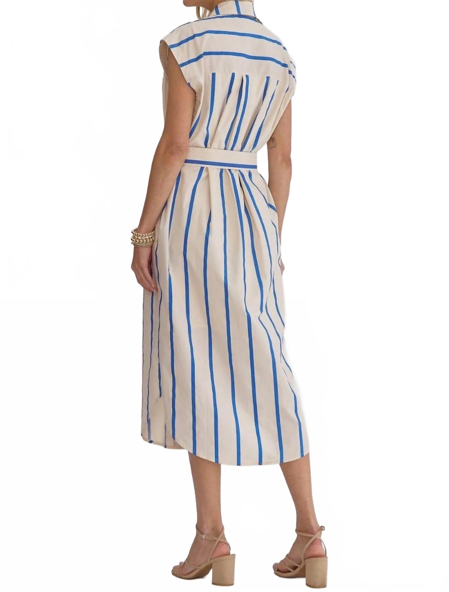 Станьте стильной этой весной с платьем миди Neon Stripes от Entro, созданным для женщин, которые любят офисную одежду с изюминкой. Это синее платье с короткими рукавами и застежкой на пуговицы, воротником и удобными карманами. Рубашка с вертикальными полосками и завязывающимся поясом выгодно подчеркивает фигуру.