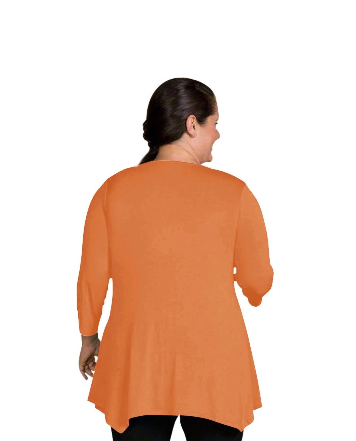 Рукава длиной 3/4, круглый вырез горловины. Застегиваются на пуговицы. Заостренный подол.