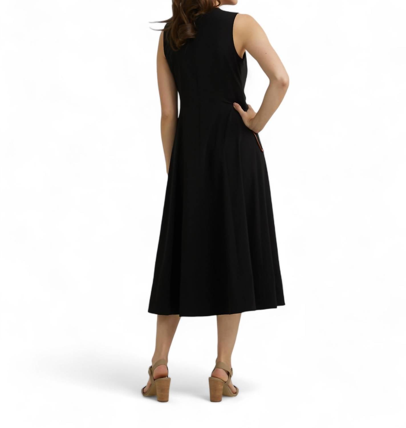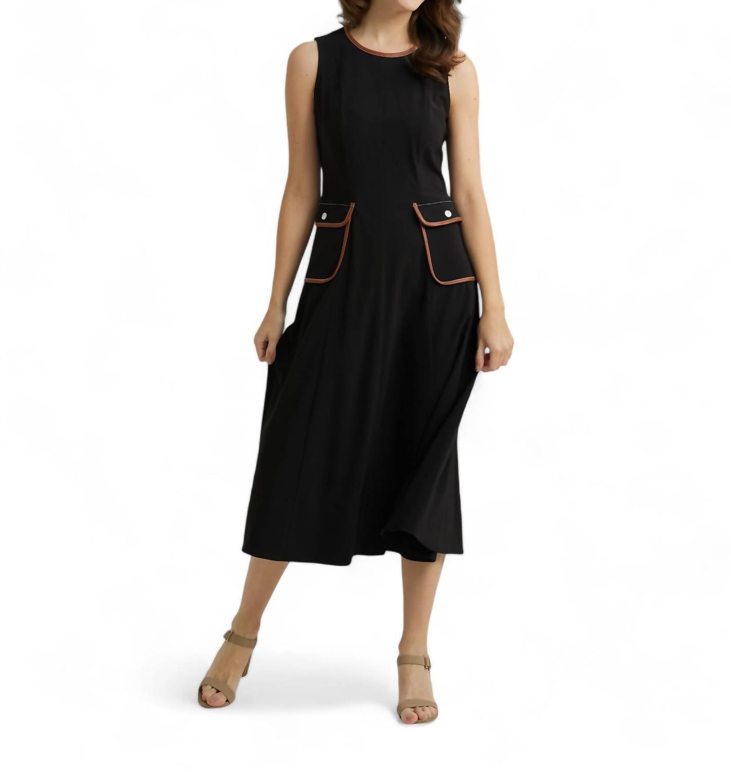 Это трикотажное платье приталенного силуэта без рукавов с бежевыми карманами, украшенными отделкой из искусственной кожи. Застежка-молния сзади. Состав: 88% полиэстер и 12% спандекс. Платье без подкладки, стирать вручную в холодной воде. Рост модели: 175 см, размер 6. Сделано в Канаде.