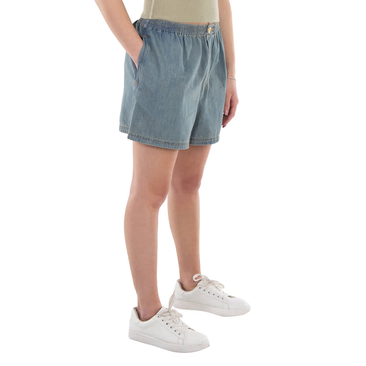 Женские шорты Moschino. Категория: Шорты. Цвет: синий. Джинсовые шорты Moschino из выцветшего хлопка. Эти джинсовые шорты с эффектом выцветания, контрастной строчкой, декоративными тиснеными золотистыми пуговицами, двумя боковыми карманами, длиной до бедра и эластичным поясом. 100% хлопок. Сделано в Италии.