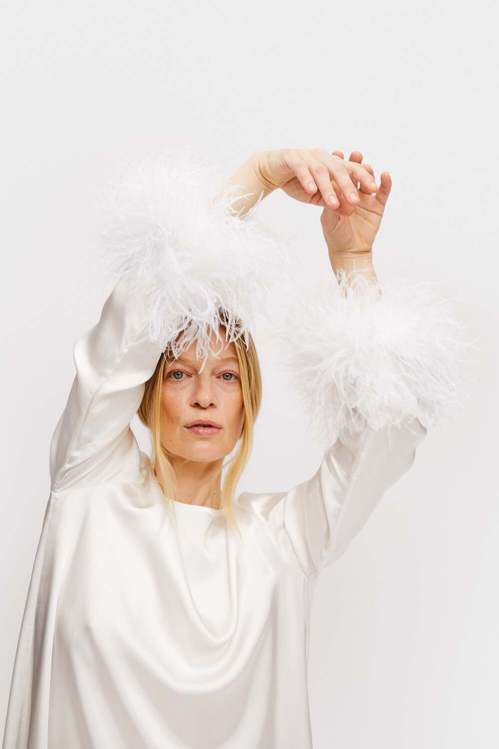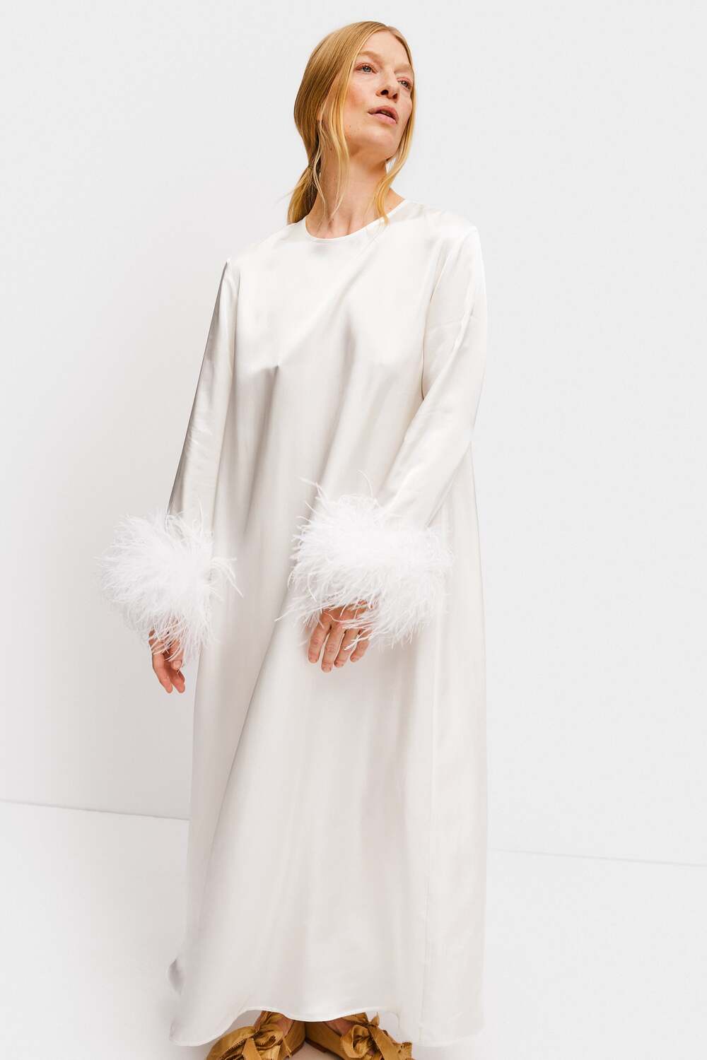 Белое макси-платье создано для особых случаев и не только. Свободный силуэт выполнен из мягкого, дышащего вискозного шелка EcoVero, сертифицированного по стандарту OEKO-TEX STANDARD 100. Круглый вырез застегивается сзади на одну перламутровую пуговицу, а манжеты рукавов украшены щедрой съемной отделкой из страусиных перьев.