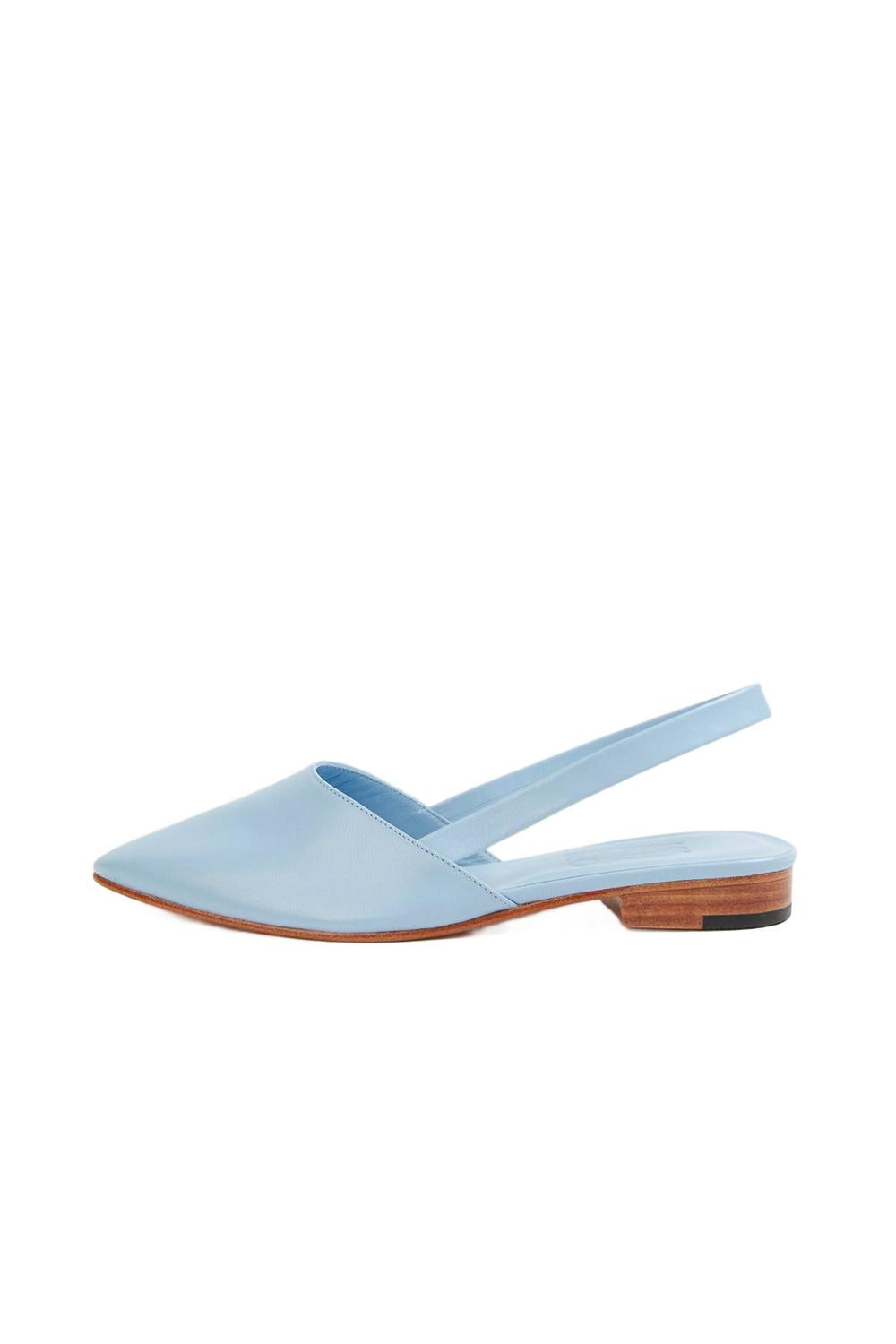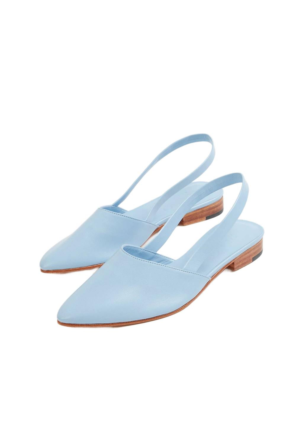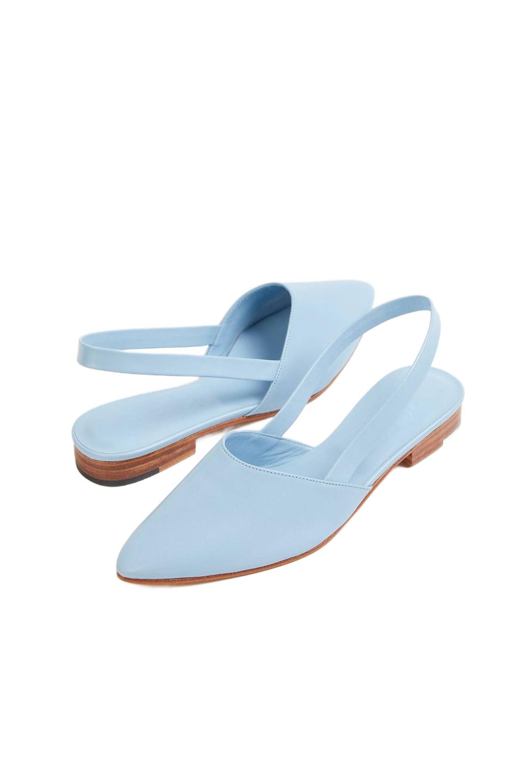 Туфли «Picnic» от Martiniano, выполненные из гладкой светло-голубой кожи, имеют заостренный носок, слегка мягкую стельку и эластичный ремешок на пятке, обеспечивающий гибкую и удобную посадку.