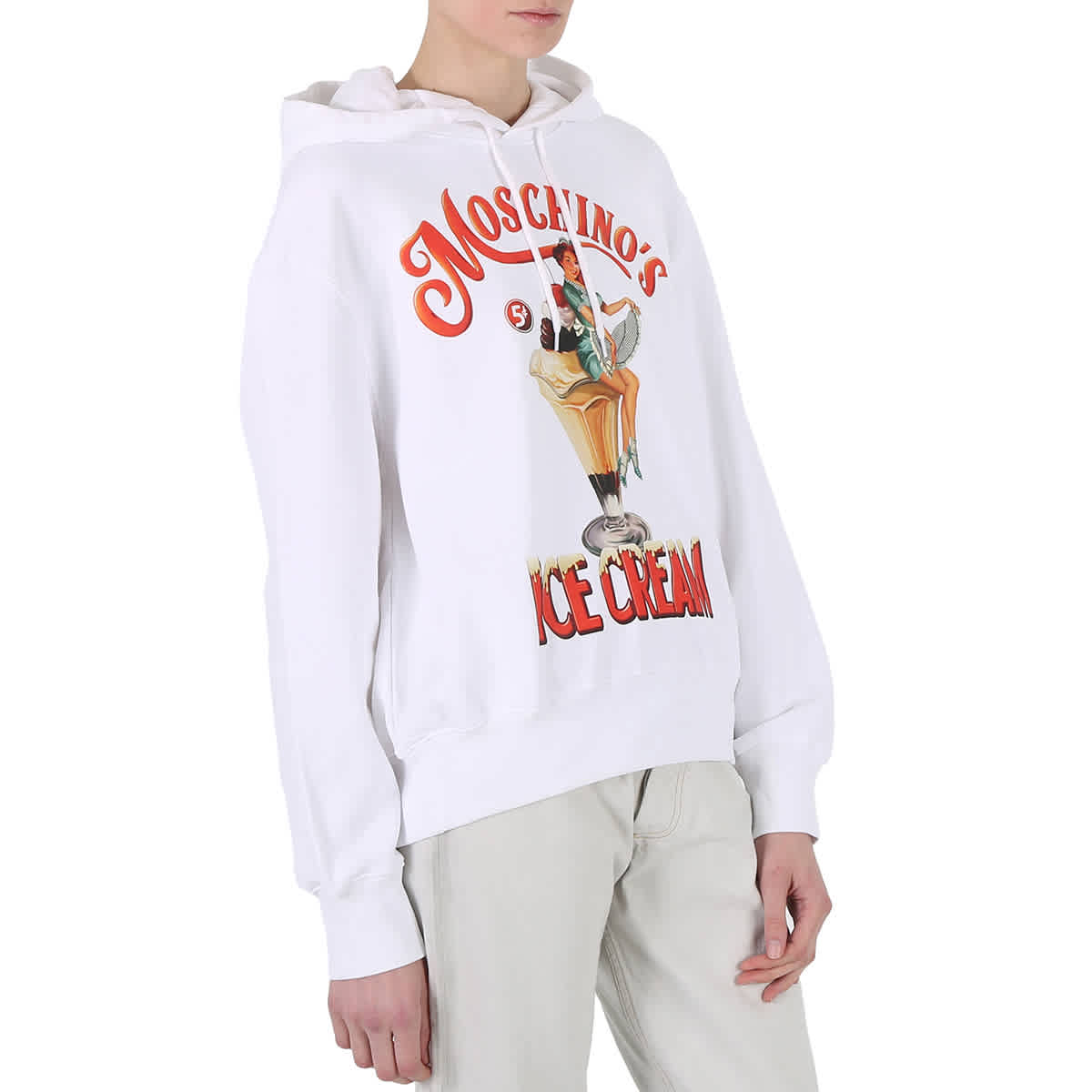 Женские топы Moschino. Категория: Мода - Худи и свитшоты. Цвет: белый. Худи Moschino White Ice с принтом логотипа из хлопка. Эта толстовка из органического хлопка с длинными рукавами, спущенной линией плеч, ребристым подолом и манжетами, капюшоном с регулируемыми шнурками и принтом «Мороженое» и логотипом.