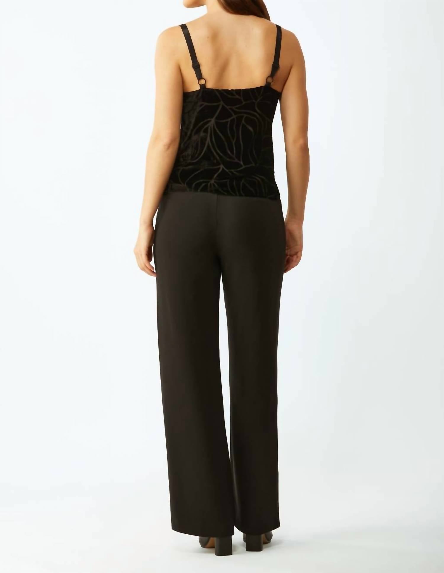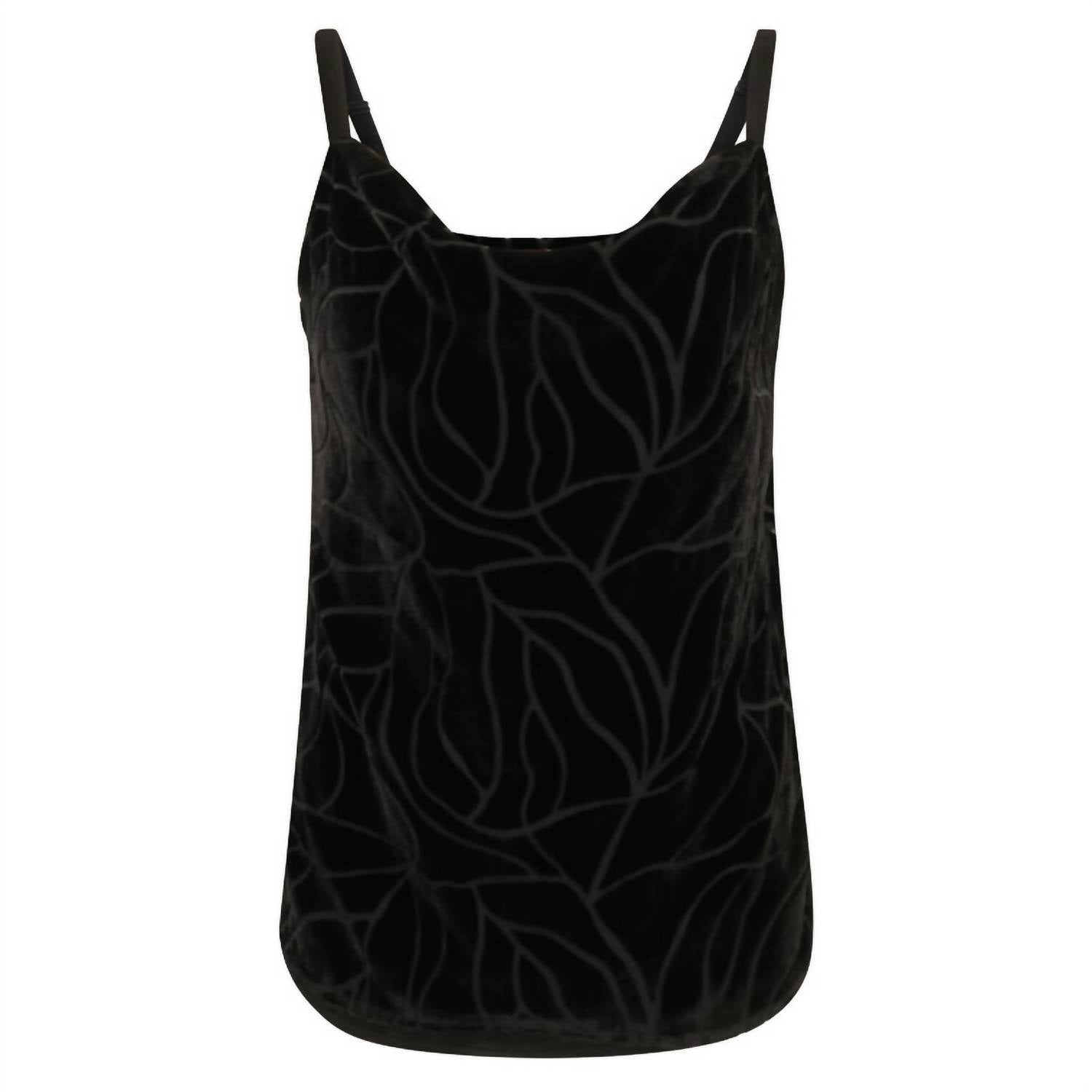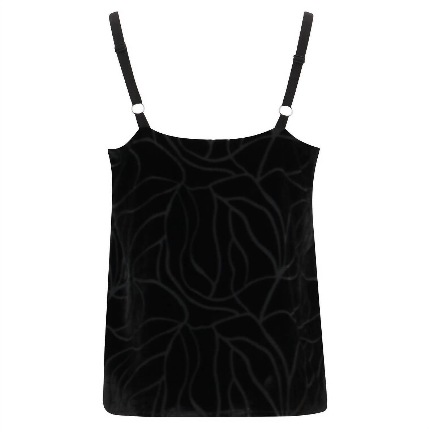 Элегантная черная майка на тонких бретельках и воротнике-хомут создают утонченный женственный силуэт. Изготовлена из смесовой вискозы с шикарным графическим узором. Стильная и удобная. Модель легко надевается. Можно стирать в стиральной машине.