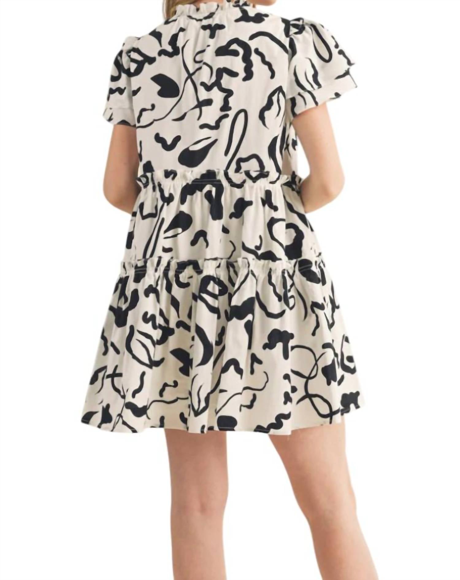 Легкое тканое платье. Короткие рукава-крылышки с оборками и завязывающийся V-образный вырез. Дополнено эксклюзивным черно-белым абстрактным узором. Высокая талия с оборками. Платье имеет А-силуэт, плавно переходящий в мини-подгибку. Непринужденная элегантность и свободная застежка.