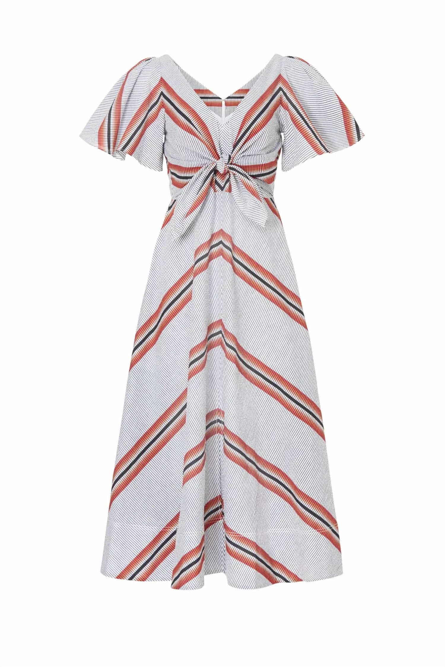 Эффектное платье миди из 100% хлопка с разноцветными полосками омбре. Короткие рукава-крылышки и V-образный вырез с функциональной завязкой спереди. А-образный силуэт дополнен удобной застежкой-молнией сзади. Длина от плеча до подола: 47,25 дюйма.