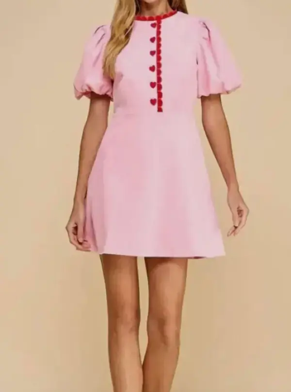 Короткое и воздушное платье для теплых дней. Почувствуйте романтику в платье Sweetheart Dress от TCEC очаровательного розового оттенка с облегающим силуэтом. Платье имеет короткие рукава-фонарики с игривыми красными пуговицами в форме сердца, подкладку и потайную молнию сзади для комфорта. Сделано в Китае. 100% хлопок.