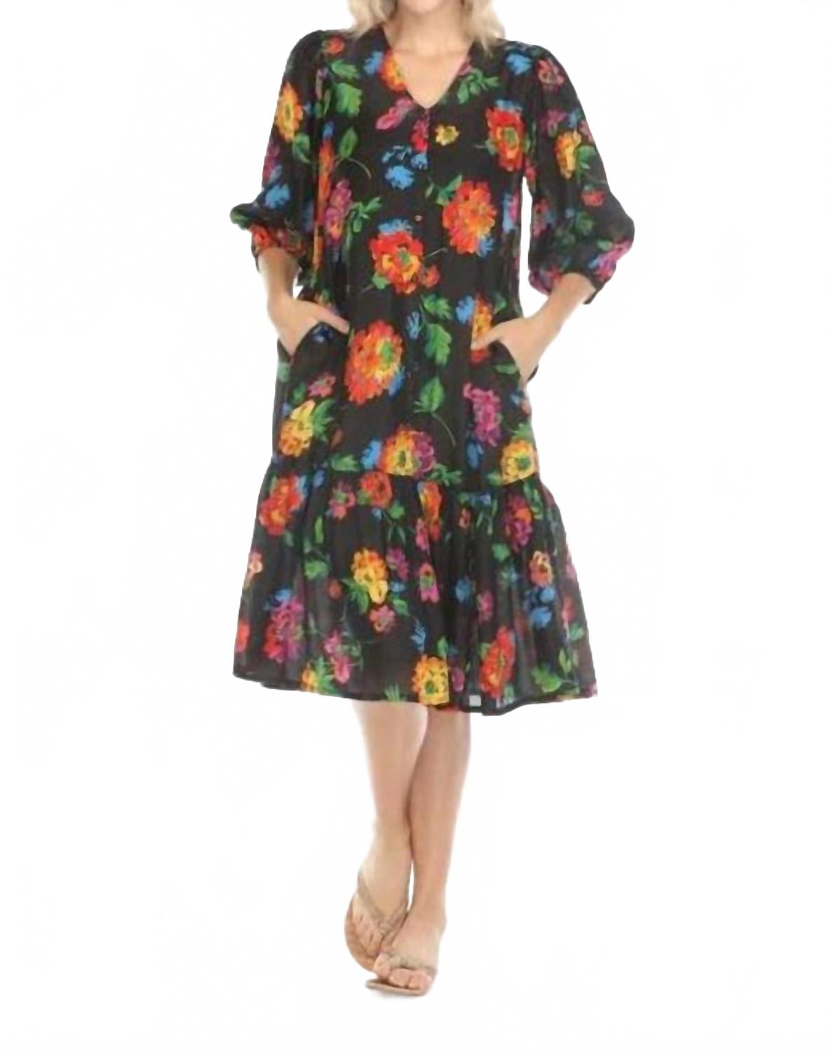 Платье идеальной длины существует. Это уникальное, неповторимое, яркое и жизнерадостное платье миди! Оно имеет комбинацию, красочный радужно-цветочный принт, застежку на пуговицы спереди, рукава-буфы с эластичными манжетами и удобные боковые карманы. Платье свободного кроя oversize выполнено в струящемся бохо-стиле.