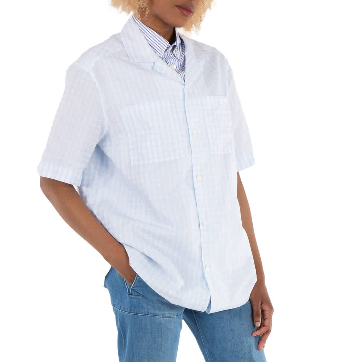 Женские топы Burberry. Категория: Рубашки и блузки. Цвет: бледно-голубой. Рубашка свободного кроя Burberry с принтом в клетку гингем. Эта рубашка из хлопковой смеси Burberry имеет прямой воротник, застежку на пуговицы спереди, короткие рукава и рисунок в клетку гингем. Состав: 65% хлопок, 35% лен.