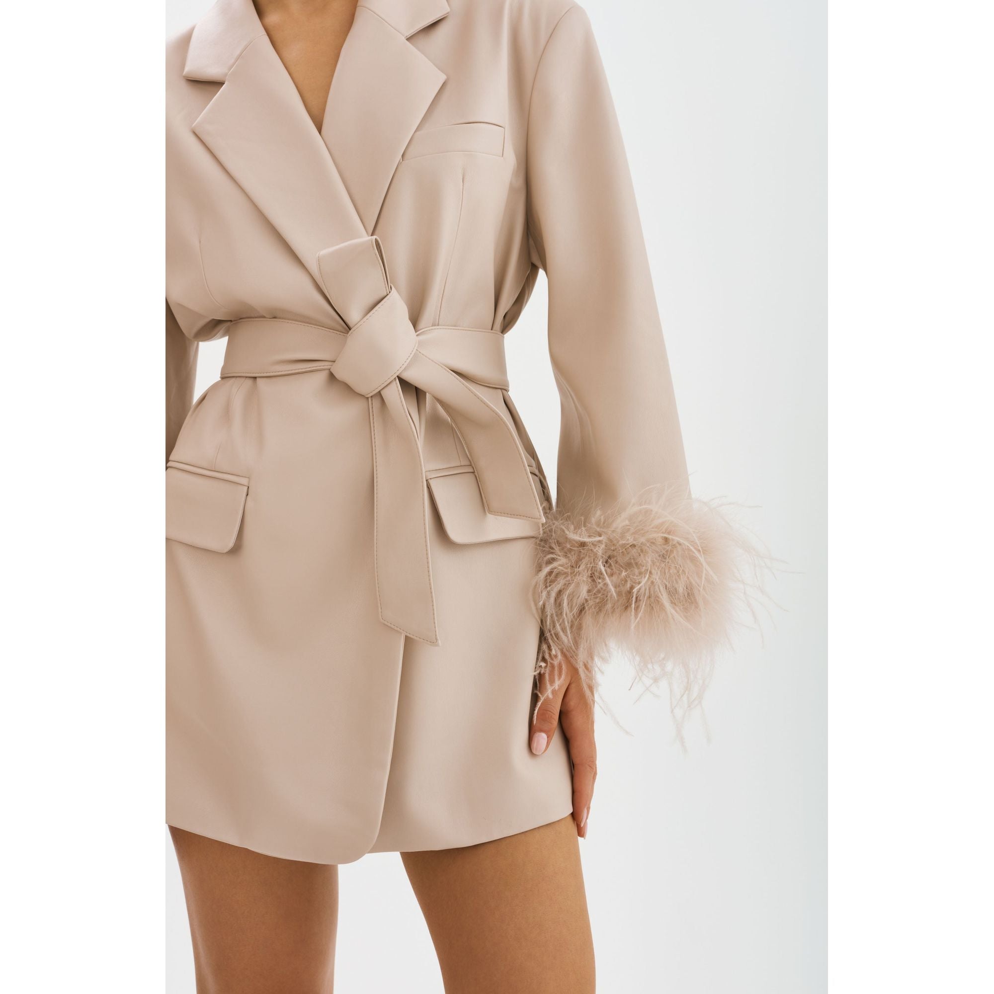 Роскошный блейзер GALIA oversize, воплощающий винтажный гламур, выполнен из мягкой искусственной кожи и украшен причудливыми перьями страуса. Он оснащен карманами с клапанами и съемным ремнем, позволяющим регулировать посадку в зависимости от настроения. Дополните образ брюками PAGETTA для еще большего эффекта.