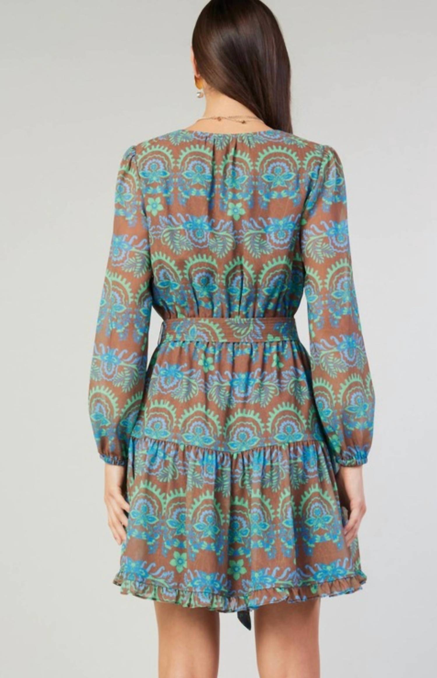 Короткое и воздушное платье для теплых дней. Представляем мини-платье с принтом от Current Air - шикарный выбор для вашего осеннего гардероба. Яркий коричнево-зеленый геометрический узор. Это платье облегающего кроя с длинными рукавами и V-образным вырезом создает привлекательный силуэт. Застежка - завязка.