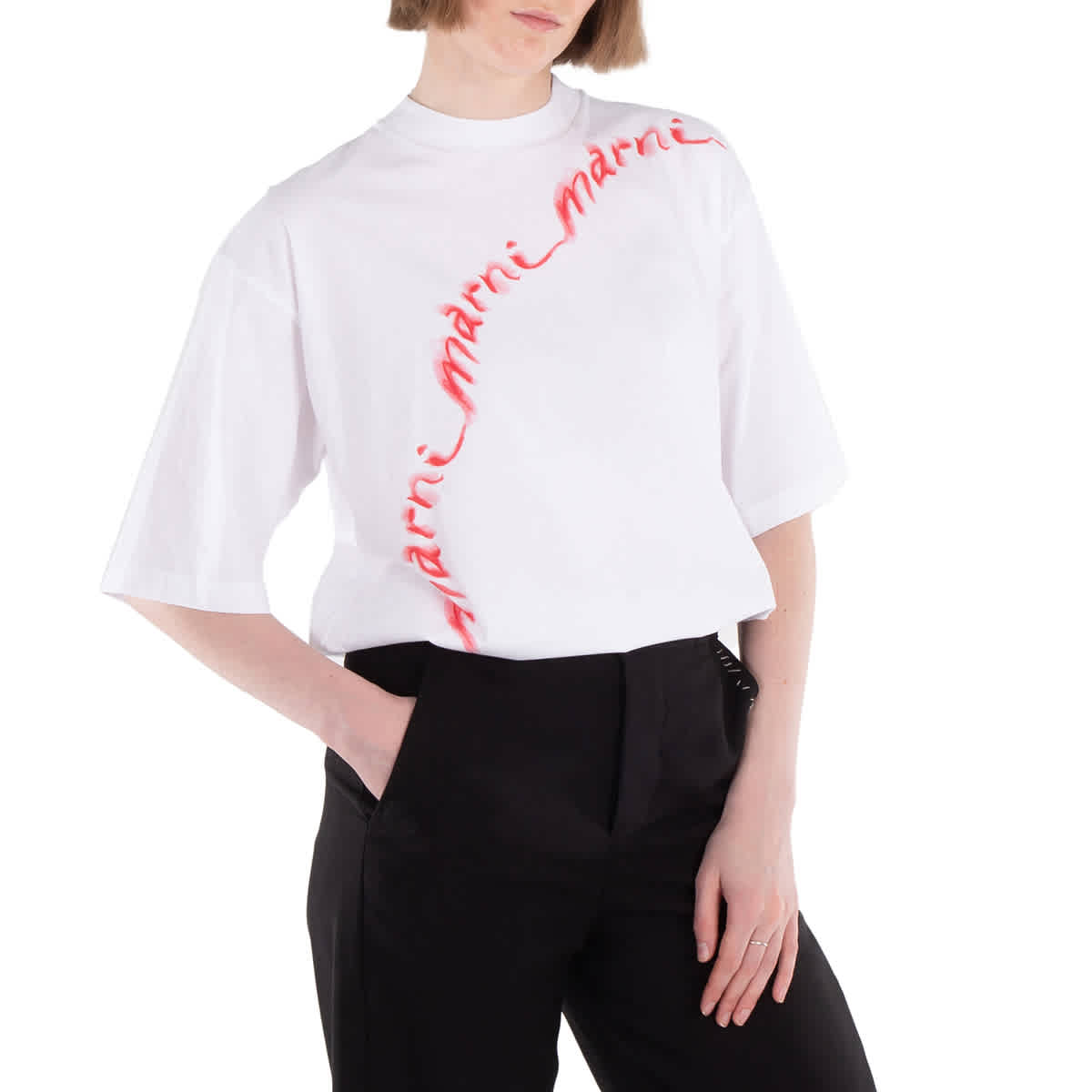 Женские топы Marni. Категория: Футболки и хенли. Цвет: белый. Футболка Marni из хлопкового джерси с волнистым логотипом. Футболка с воротником-стойкой, спущенными плечами, короткими рукавами увеличенного размера и повторяющимся красным логотипом спереди. Состав: 100% хлопок.