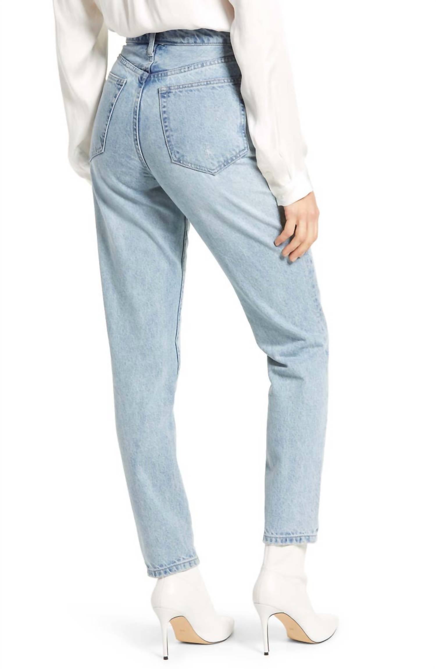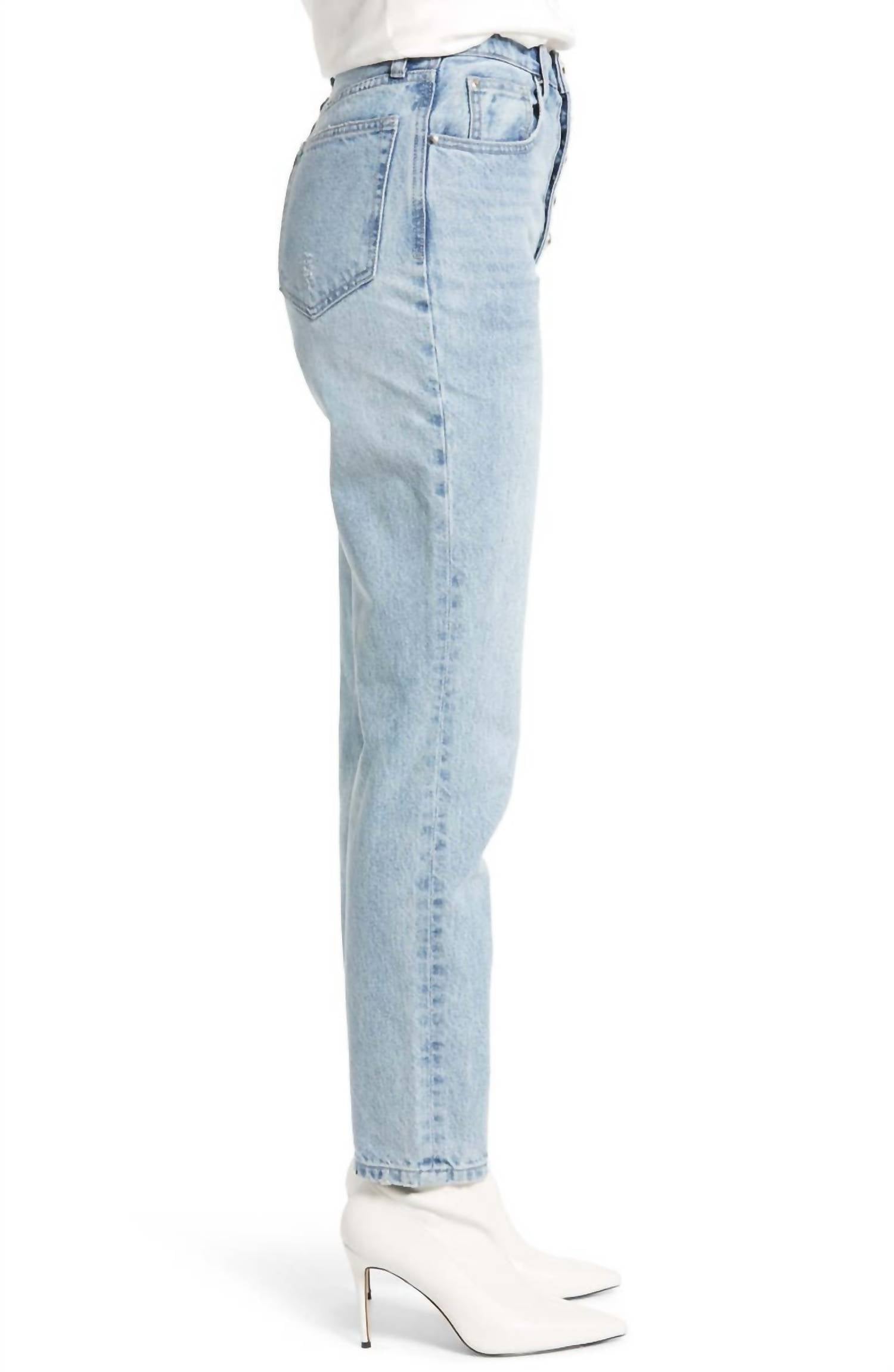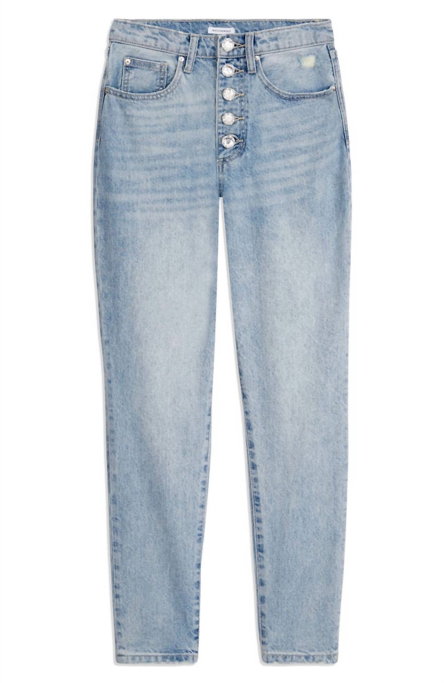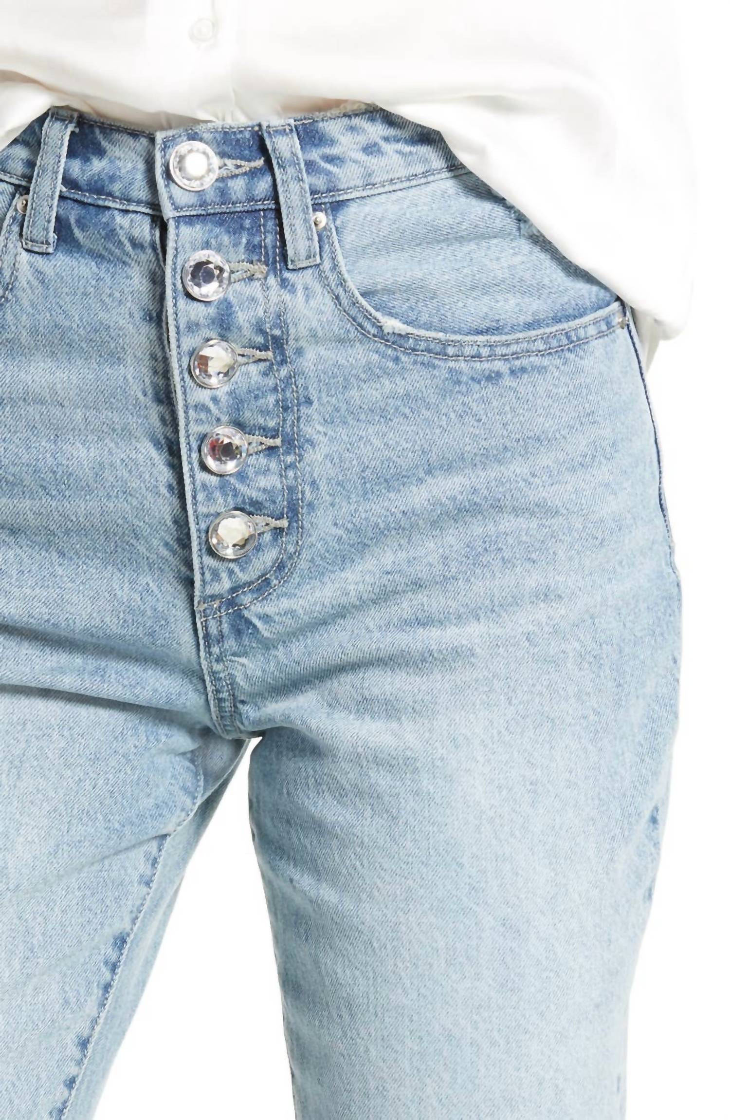 Застежка на пуговицы, украшенная кристаллами. Модель с пятью карманами. Легкие потертости, заломы и потертости. Неэластичный деним. Состав: 100% хлопок. Машинная стирка в холодной воде. Размеры: талия 12 дюймов, внутренний шов 29 дюймов, брючины 11,5 дюймов.