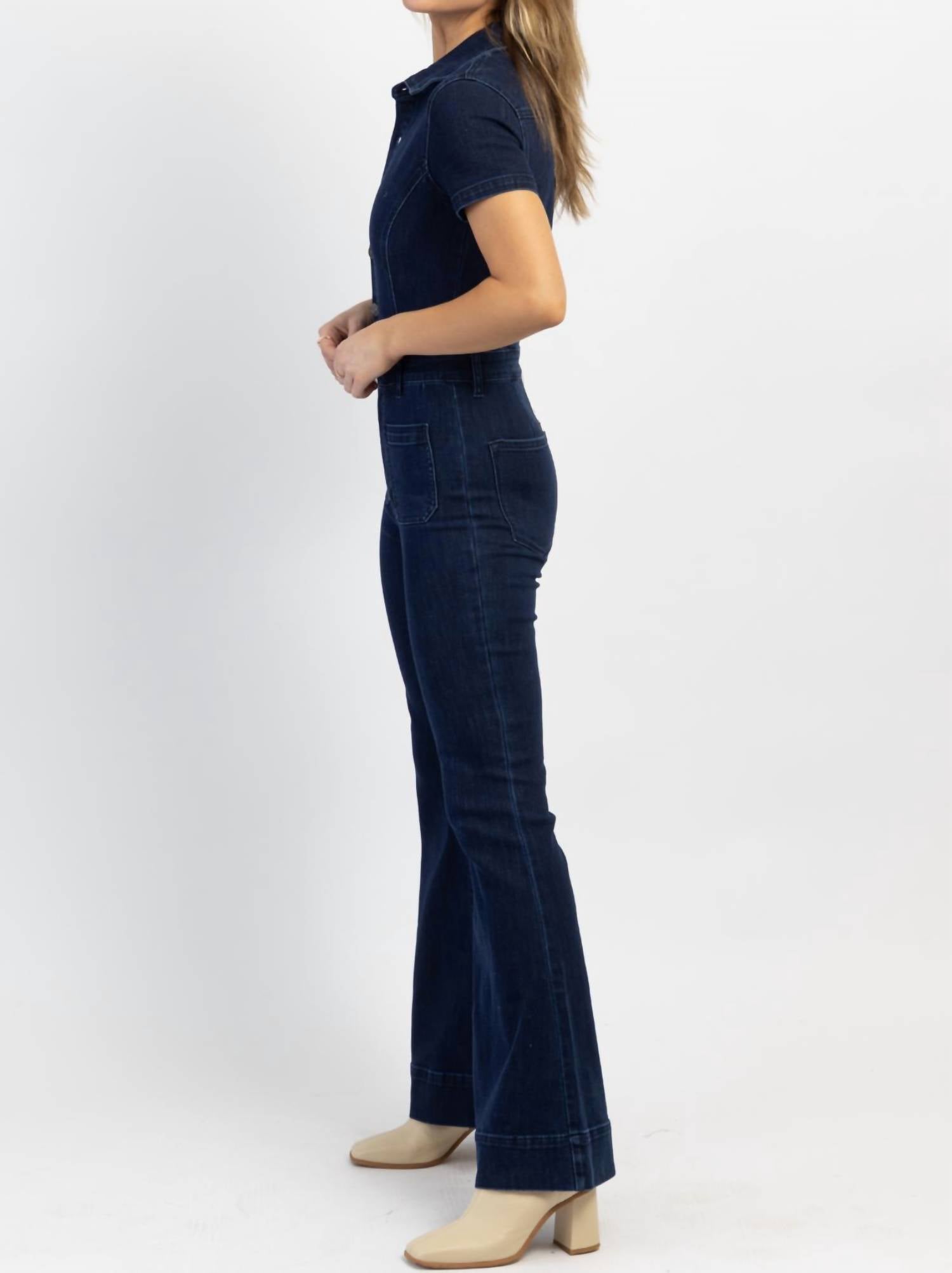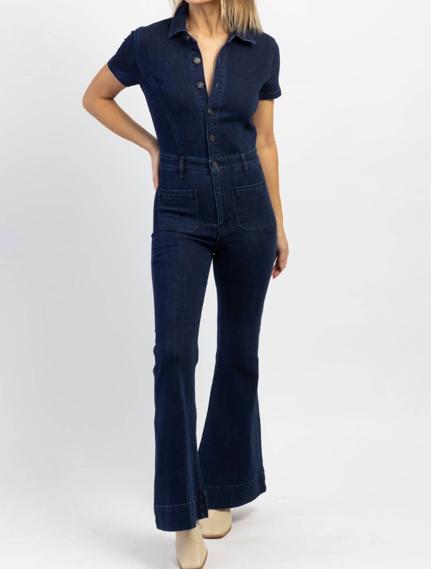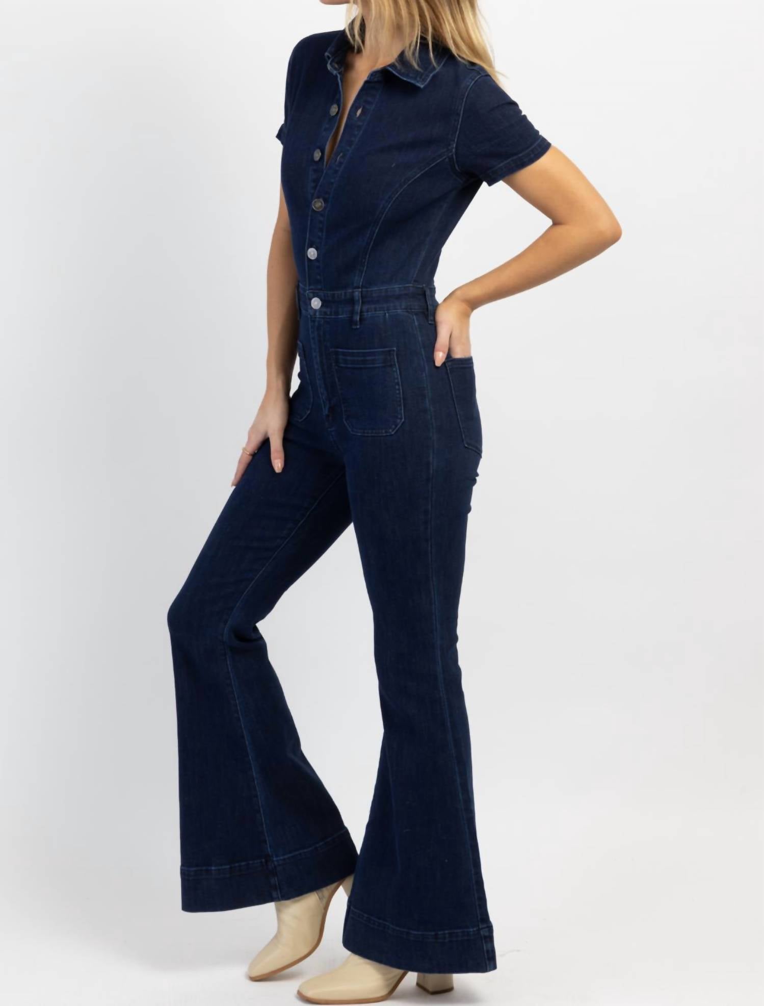 Темный деним, застежка на пуговицы спереди, короткие рукава, воротник, очень расклешенный крой. 100% хлопок. На модели размер S, рост 178 см.