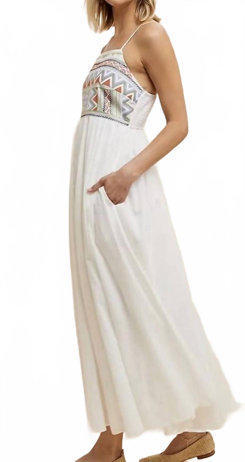 Платье макси, которое так же мило, как и удобно. Платье макси с вышивкой в ​​стиле бохо, выполнено из хлопка. Яркий графический вышитый рисунок на груди. Боковые карманы. Присборенная спинка для удобства посадки. Завязывающаяся сзади лента. Регулируемые бретели. Скрытая молния сбоку. Подкладка.