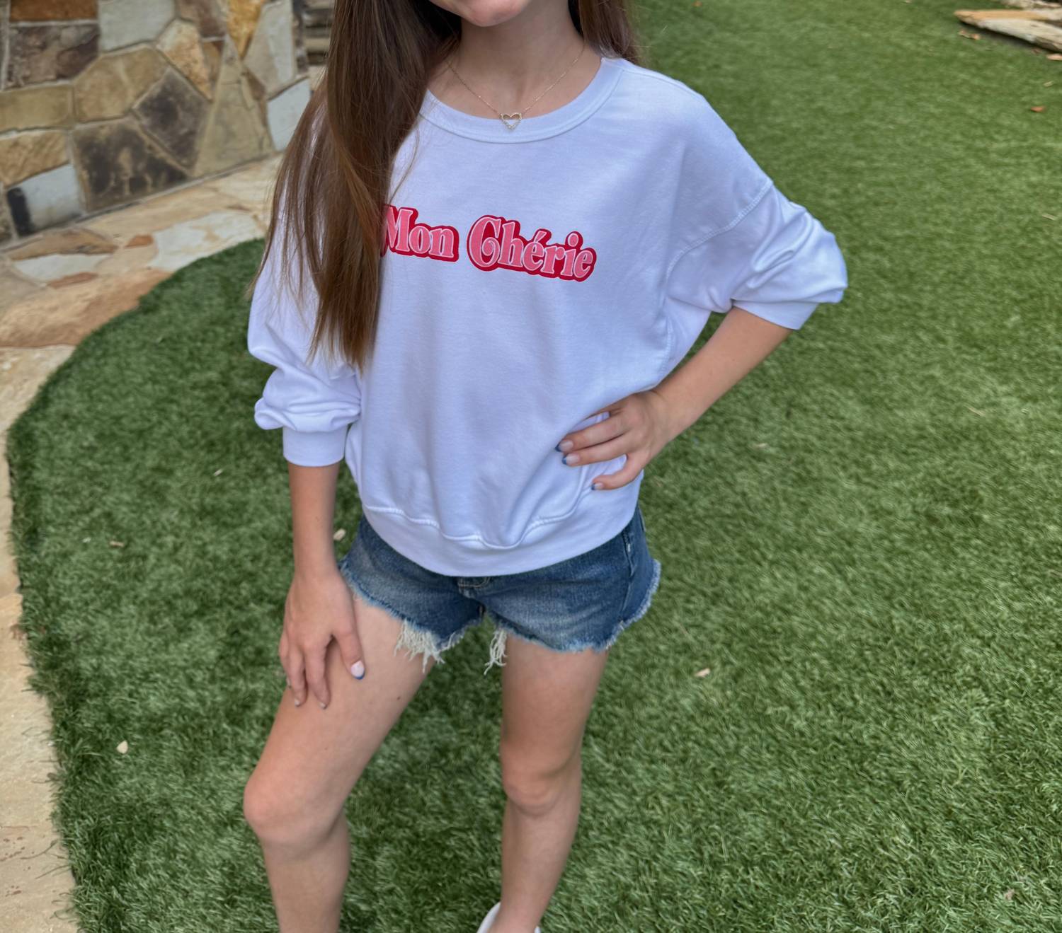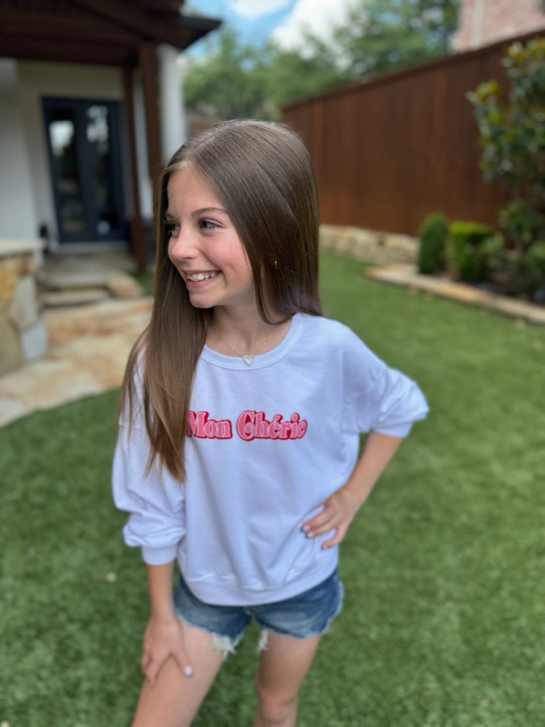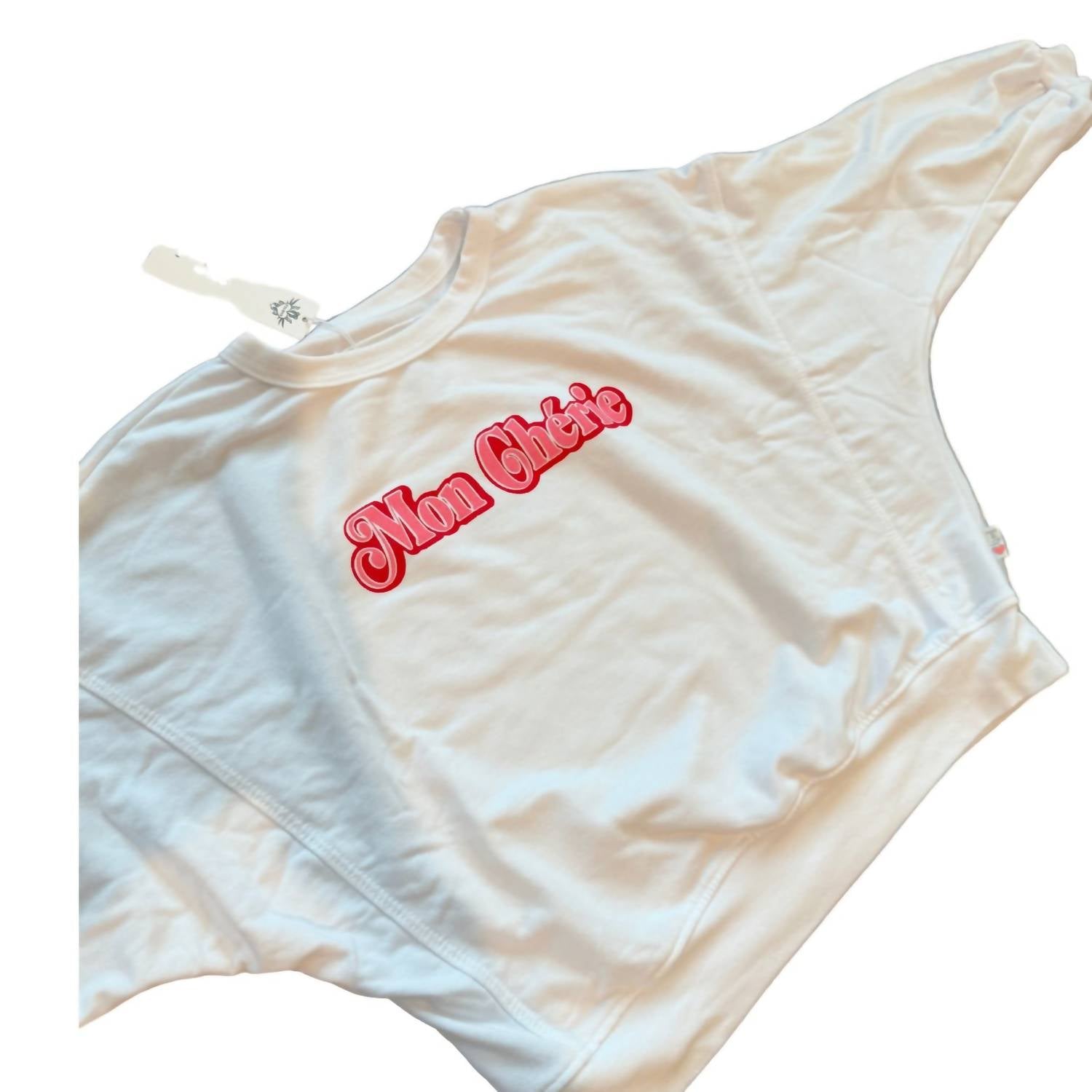Стильный белый свитер для юных модниц. Джемпер с длинными рукавами. Изготовлен из мягкой смеси 50% вискозы и 50% полиэстера. Украшен очаровательным принтом Mon Cherie. Сделано в США. Свободный крой и длина ниже талии обеспечивают максимальный комфорт. Легко стирать в стиральной машине.
