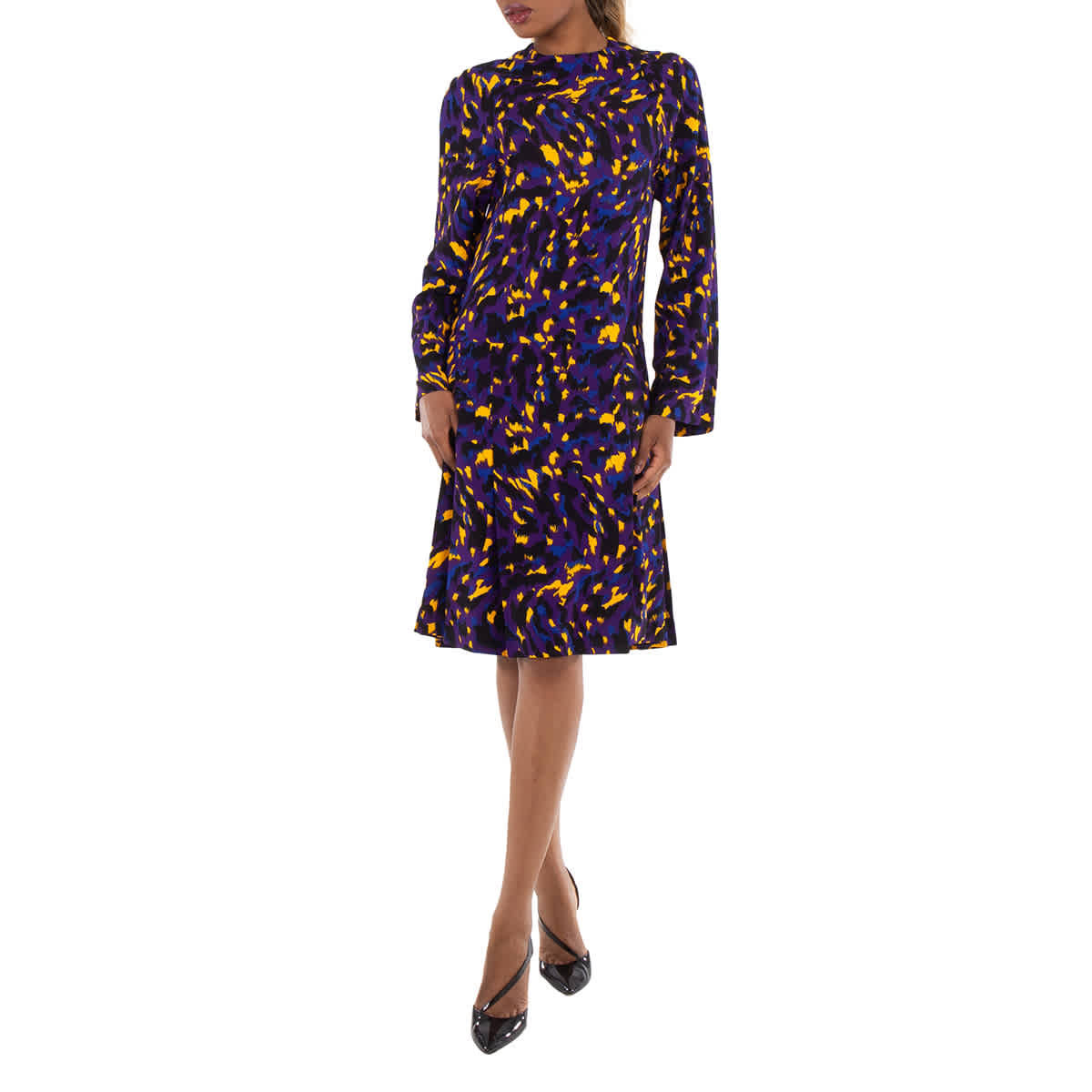 Женские платья Burberry. Цвет: рисунок Thistle Ip. Платье Burberry с камуфляжным принтом. Это платье эластичной конструкции с камуфляжным принтом, застежкой-молнией сзади, складками на круглой горловине и длинными рукавами. Состав: 96% вискоза, 4% эластан. Сделано в Италии.