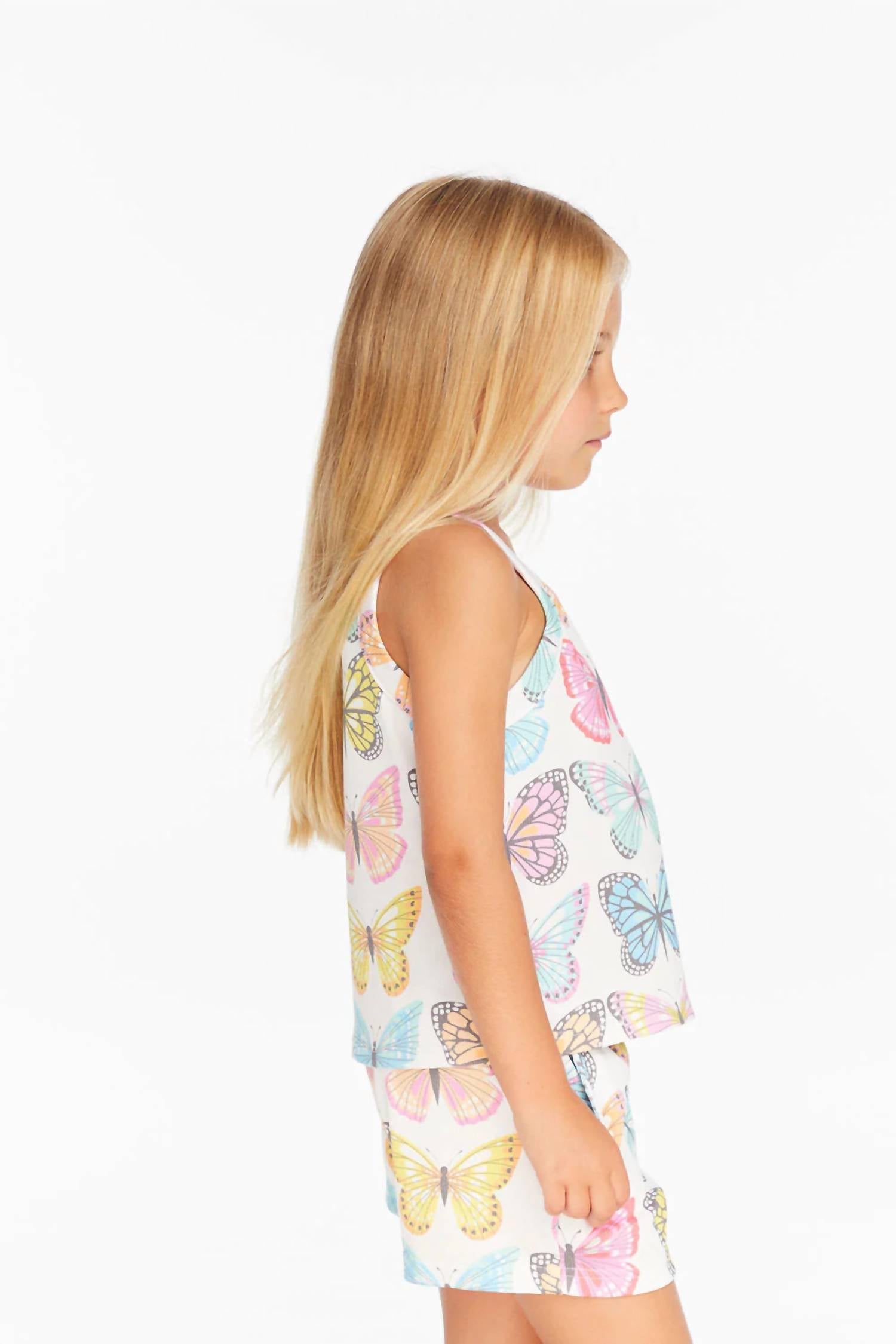 Эта майка бежевого цвета без рукавов, состоящая из 95% хлопка и 5% спандекса, обеспечивает идеальный баланс комфорта и эластичности для энергичной игры. Яркий принт с бабочками добавляет игривости, делая майку идеальной для повседневных сочетаний с джинсовыми шортами или сандалиями.