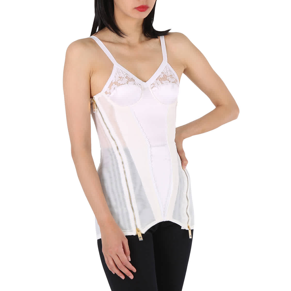 Женские топы Burberry. Категория «Мода» - Корсеты. Цвет - оптически-белый. Кружевной топ-корсет Burberry Optic White. Корсет из шелкового атласа и эластичной сетки, изящно украшен цветочным кружевом. Состав: 100% шелк Mulberry, 71% полиамид, 29% эластан. Сделано в Италии.