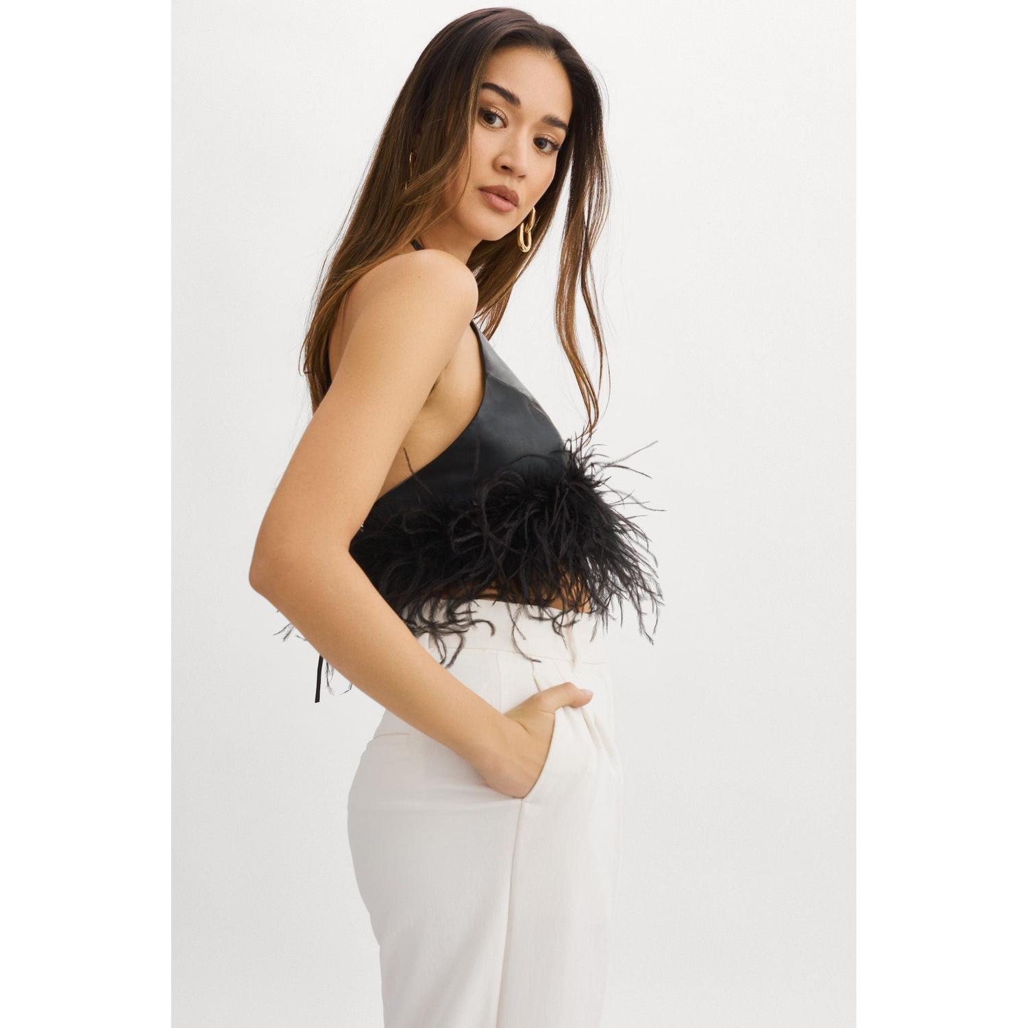 Сочетание игривости и роскоши - это универсальная и эффектная вещь, которой так не хватает в вашем гардеробе. Этот топ в стиле 90-х, украшенный развевающимися страусиными перьями и выполненный из мягкой кожи ягненка, сочетается с чем угодно: от брюк с высокой талией до эффектных юбок.