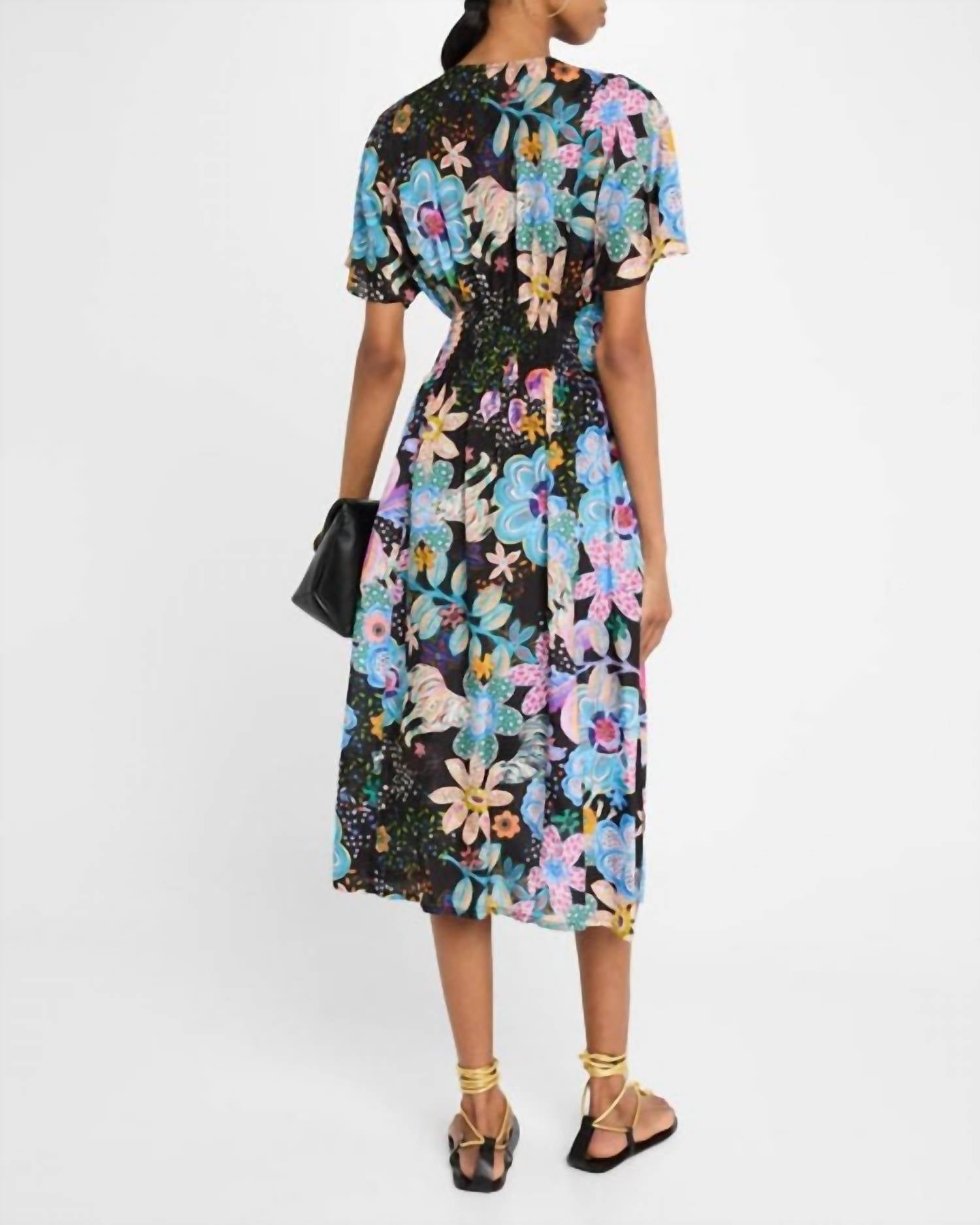 Платье идеальной длины существует. Плиссированное платье миди с забавным цветочным принтом «Каэтана». У платья круглый вырез, застежка на пуговицы спереди, короткие рукава «летучая мышь», присборенная талия и А-образный силуэт. Незаменимая вещь для любого случая.
