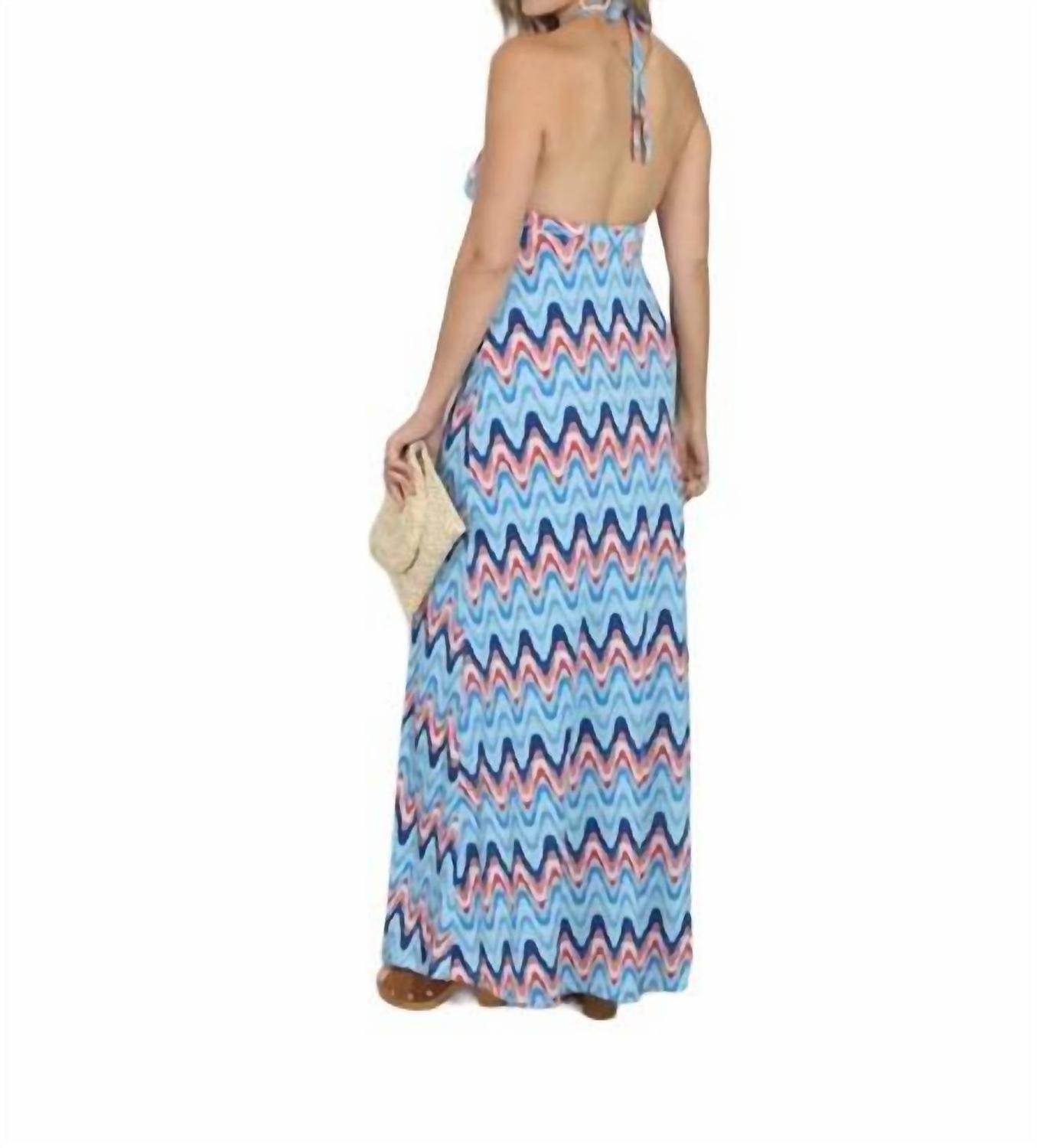 Платье с волнистым дизайном, халтер, макси-длины и глубоким V-образным вырезом. Завязка на шее и завышенная талия. Состав: 96% полиэстер, 4% спандекс. Размер в размер. Машинная стирка в холодной воде.