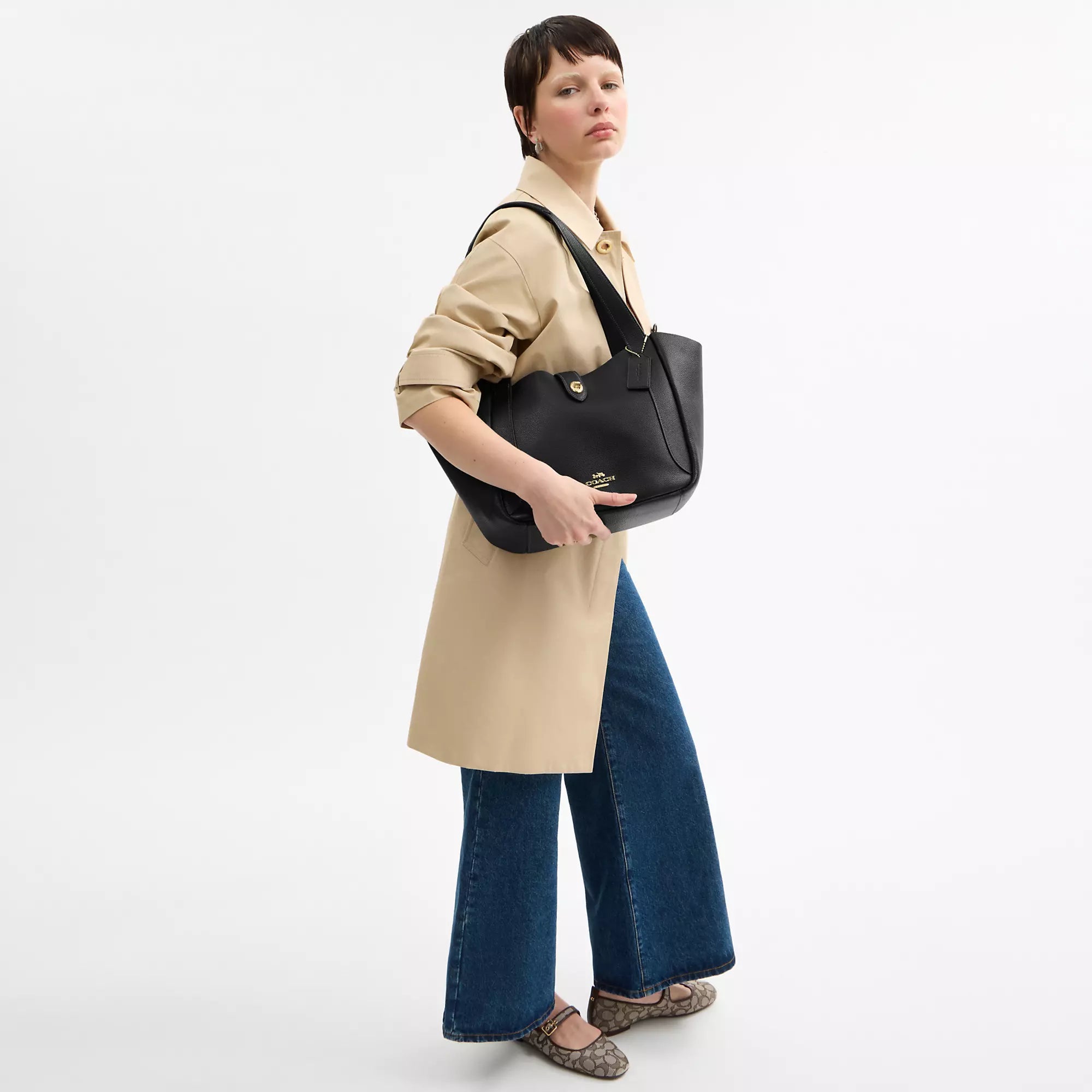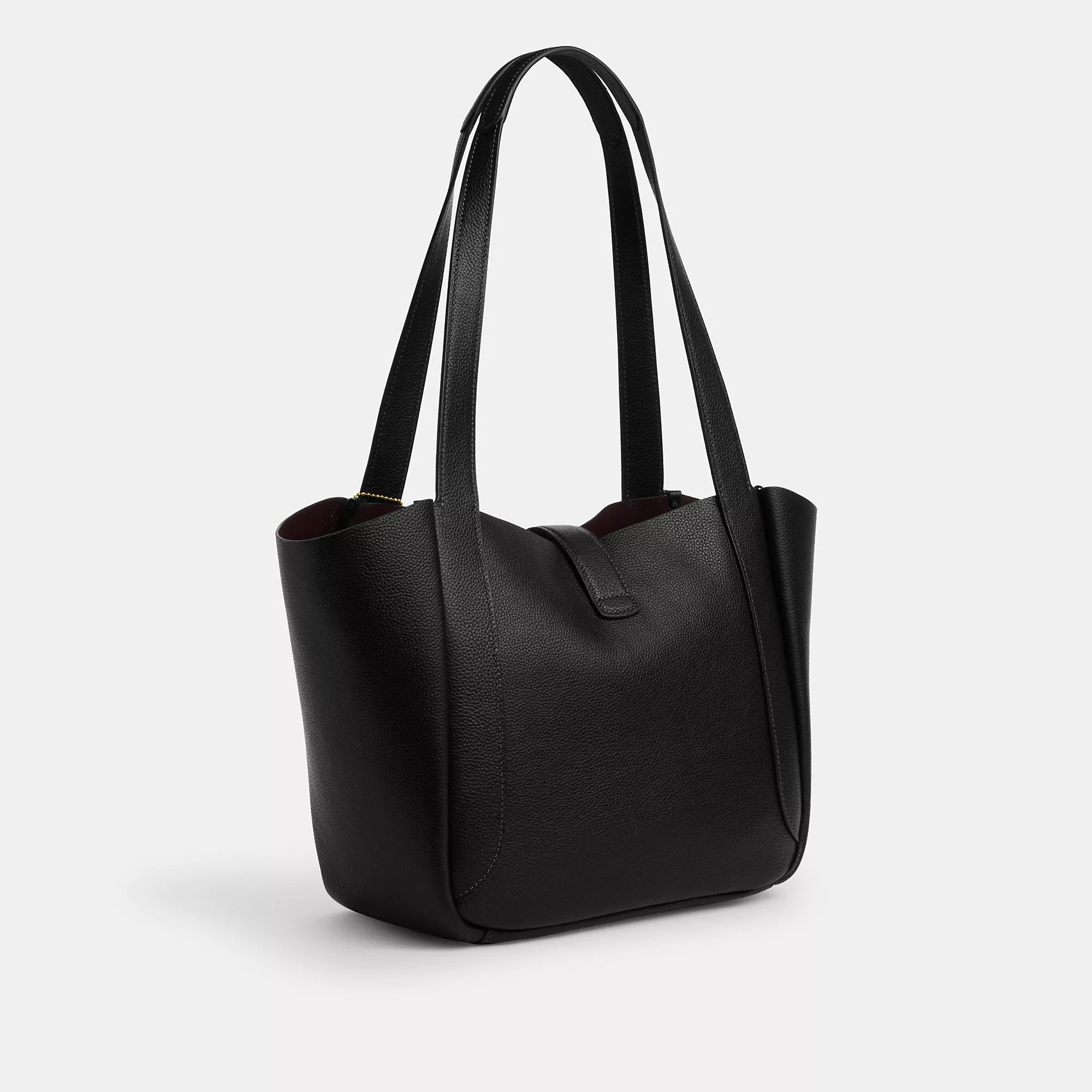 Двусторонняя кожаная сумка-тоут Hadley Turnlock с внутренним карманом на молнии. Застежка-поворотник. Ручки с глубиной 11 1/2 дюйма. Размеры: 10 3/4 дюйма (Д) x 9 1/2 дюйма (В) x 5 дюймов (Ш). Модель № CAL17 | Coach Outlet. Сумка-тоут Hadley Turnlock - черная.