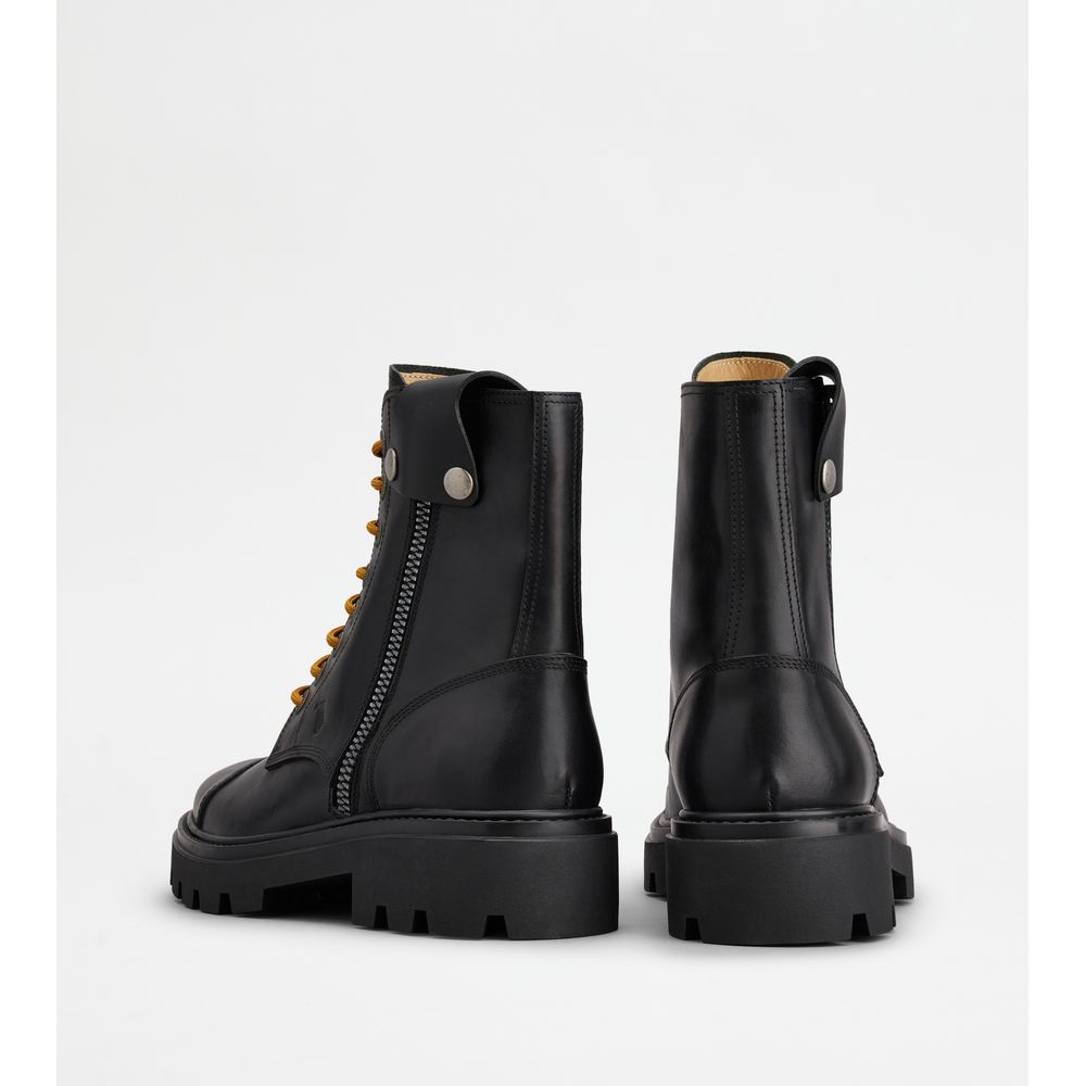 Современные тенденции городского стиля и изысканный ручной труд гармонично сочетаются в этих смелых армейских ботинках с молнией снаружи. Они оснащены рифленой резиновой подошвой, ремешком с кнопками по верхнему краю и монограммой Tod's, вышитой сбоку.