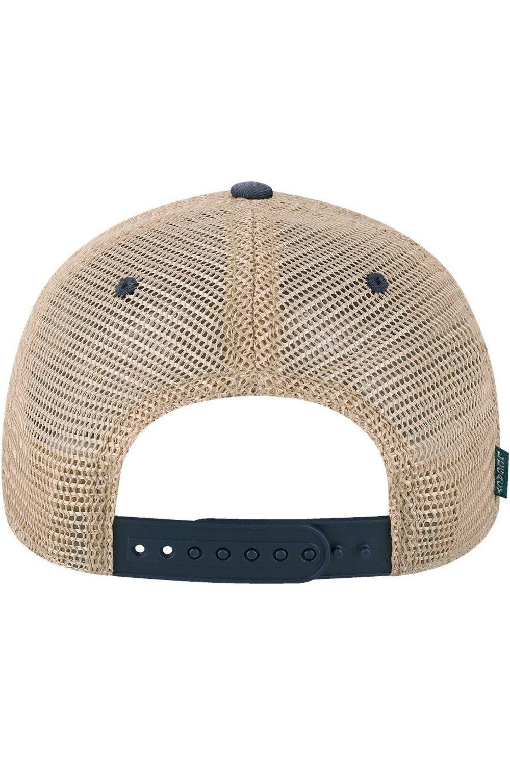 65/35 хлопок/полиэстер. Верхняя часть и сетка из грязно выстиранного хлопкового твила. Неструктурированная, шестипанельная, низкопрофильная. Изогнутый козырек, зеленый подглазник, козырек с переходом на переработанный материал. Контрастная застежка-кнопка.