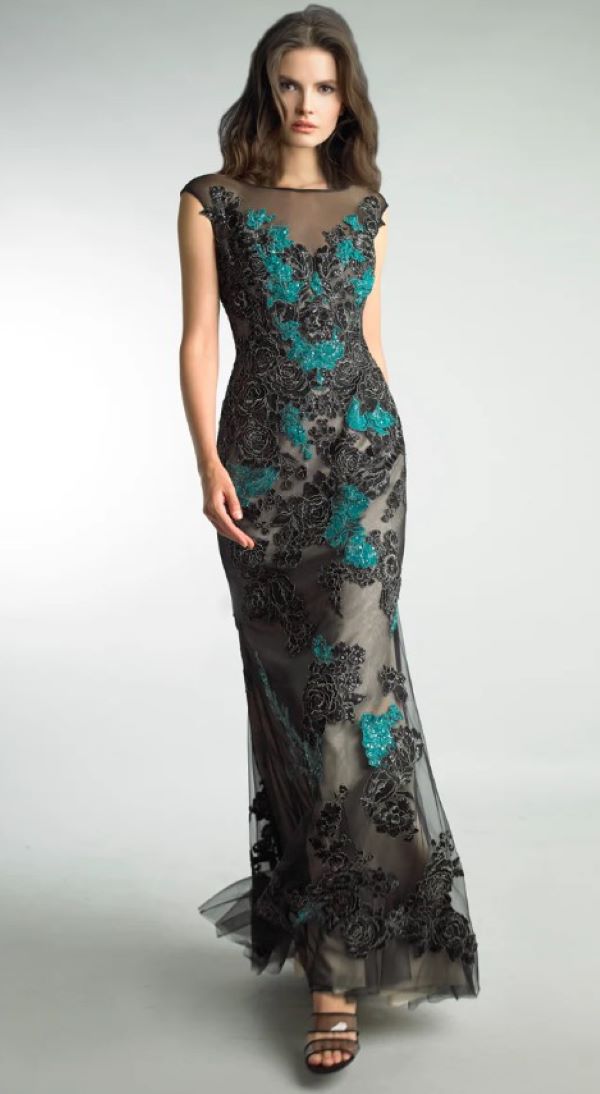 Это платье без рукавов с прозрачной верхней частью. Лиф облегающий, переходит в струящуюся юбку длиной до пола. Прозрачный верхний слой украшен контрастными цветами по всей длине. Это шикарный выбор для любого торжественного случая.