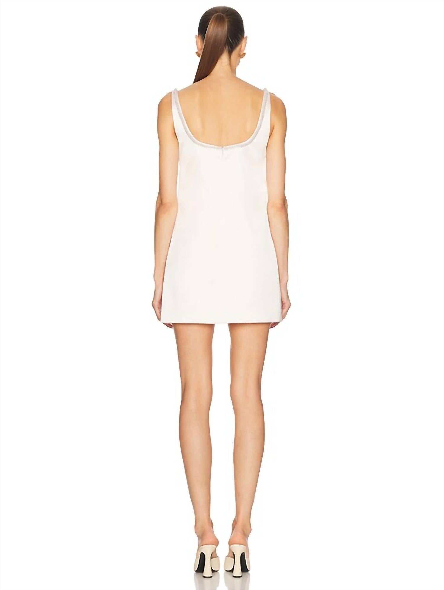 Короткое и воздушное платье для теплых дней. Только химчистка. Полностью на подкладке. Потайная застежка-молния сзади. Горловина украшена стразами и жемчугом. Прорезные карманы по бокам. Атласная ткань с кружевной вставкой на груди.