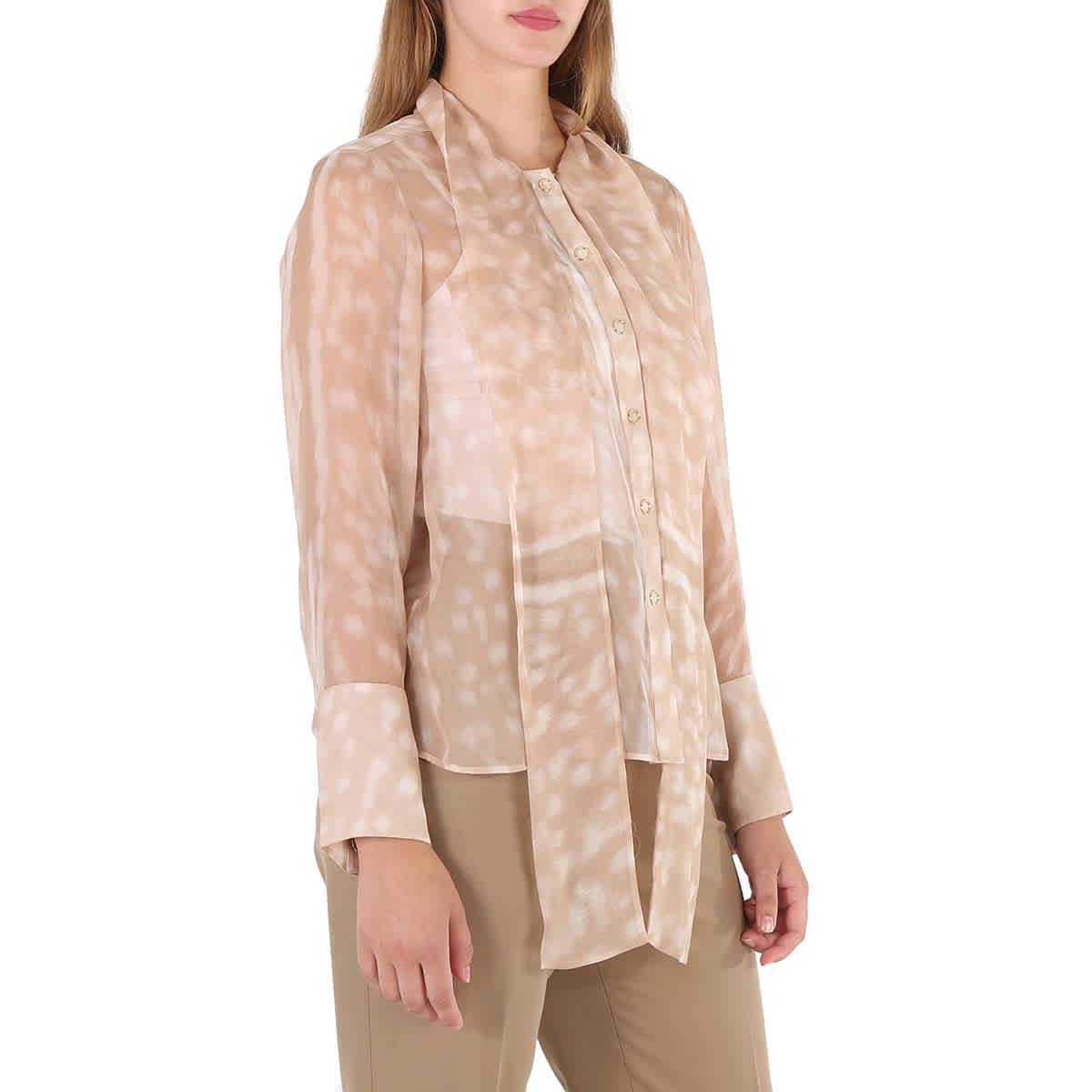Топы Burberry. Цвет: бежевый. Блузка Burberry бежевого цвета с бантом в виде оленя. Воротник-стойка с бантом спереди, потайная застежка спереди, длинные рукава и принт с пятнистым оленем. 100% шелк Mulberry.